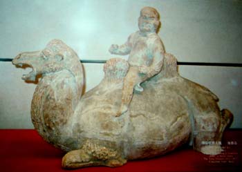 Figur fra Det historiske museum i Xi’an. Teksten på mandarin under figuren siger ”Hu Ren.” Dateret til Tang dynastiet, dvs. 618-907 e.Kr. Under Tang Dynastiet var betegnelsen “Hu” generelt forstået som “barbarer” og et tidligt rytterfolk på steppen. Det må være herfra navnet “Hunner” er opstået. Personen på kamelen er uden for tvist indoeuropæer og for kineserne “en barbar”. Når vi nu lige har hørt at den nordlige Aorsi -stamme på kameler importerede handelsvarer så kan denne figur vise netop et eksempel på dette. Kilde: Bent Hansen fra Guangzhou, Guangdong der tog billederne på Det historiske museum i Xi’an og gav mig oplysningerne om figurerne fra museet.