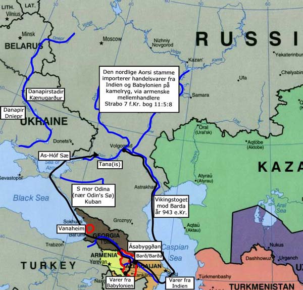 I ovennævnte kort forsøger jeg at sammenfatte mine konklusioner og vise hvor strategisk vigtigt det har været for det nordlige Aorsi-folk (Ver Asir/Danir ) at have landbesiddelser syd for Kaukasus bjergene for at kunne få adgang til transportvejene, floderne, der kunne fragte varerne op. Strabo beretter videre at byen Tanais bestod af delvis asiatiske, delvis europæiske nomader, og delvis at dem der sejlede på søen (Asovhavet ) fra Bosporus. Her har vi efter min mening en absolut vigtig oplysning. Beskrivelsen af Ver Asir/danir-stammen, uanset om vi hører den beskrevet som Qin, Wu-sun eller Aorsi, er et hestefolk, ikke et søfolk. Derfor må stammen optage folk udefra med kulturelt nedarvede søkundskaber. De søfolk Strabo her henviser til synes at komme fra det Bosporiske Kongerige, der i samtiden er under ledelse af Kong Asburg (år 8 f.Kr. – 38 e.Kr.). Jeg argumenterer for at Kong Asburg er en af vore egne kongesønner. Se afsnittet ”Kongerne Asander & Aspurg - Det Bosporiske kongerige”. Alternativt, eller måske er det identisk, kan det være folk fra Tanitae-folket, der boede langs Tanais-floden, og som derfor må have været søfolk. Der må være en endog stor sandsynlighed for at oprindelsen til ”Tana/Tani” fra runeskriften på Jellingestenen er fra Tanitae-folket, og at dette er uroprindelsen til begrebet ”Danerne”. Widsith-digtet (600 tallet om år 350-450 e.Kr.) har den yderst mærkværdige betegnelse ”sædenum” eller ”sødanerne” som en beskrivelse af dele af Danerne. Det tyder på at der har været en speciel æt inden for stammen, der var specialiseret i søfart. Ptolemy placerer år 127 e.Kr. Tanaitae -folket hvor Tanais-floden slår et knæk i år 127 e.Kr., dvs. lige midt i vort landområde. Senere hører vi Ammianus Marcellinus (300 tallet e.Kr.) forklare at Hunnerne nedslagtede Tanaitae -folket og inddrog de overlevende i Hunnerhæren. Dette udelukker ikke at en æt af Tanaitae-folket kan være fulgt med Ver Asir/Danir stammen under folkevandringen derfra tidligere. Ptolemy placerer det sydlige Aorsi -folk under Agathyrsi folket fra Transylvanien i år 127 e.Kr. De fleste kilder siger at det sydlige Aorsi-folk blev opslugt af andre Sarmatiske stammer og forsvinder sporløst. At historien ikke kan berette mere om det nordlige Aorsi -folk (Ver Asir/Danir ) udover Strabo år 7 f.Kr. betyder at folket var uden for romernes radarskærme. Det virker helt usandsynligt at et folk med 200.000 ryttere i syd, og et antal større end dette længere nordpå, som Strabo beretter, skulle forsvinde fuldstændigt. Efterser vi hvem der skrev historien i tidsrummet, så var det kinesiske historieskrivere i Han-dynastiet mod øst. Det nordlige Aorsi-folk (Ver Asir/Danir ) er derfor ikke vandret østpå for så ville vi finde dem i kinesiske krøniker. Romerne havde styr på alt hvad der rørte på sig omkring Middelhavet, Sortehavet og Asovhavet . Det nordlige Aorsi-folk (Ver Asir/Danir) kan derfor heller ikke været vandret mod syd. Romerne havde ligeledes styr på alle folkene i Germania. Dette viser Pomponius Mela (år 40 e.Kr.), Plinius den ældre (år 23-79 e.Kr.), Tacitus (år 98 e.Kr.) og Ptolemy (år 127-148 e.Kr) er tilfældet 1 . Det nordlige Aorsi-folk (Ver Asir/Danir) er derfor heller ikke vandret mod vest, udover den sydlige del af folket vi finder i Transylvanien hos Ptolemy. 1 Se Bilag H: Kort of folkeslag. Den eneste mulighed er at det nordlige Aorsi -folk (Ver Asir/Danir ) er vandret mod nord eller mod nordvest, nord for Germania. En folkevandring denne vej har været uden for romernes synsvinkel, og derfor den sikreste vej at undgå dem på. Strabo beretter (bog 11:2:2) at der ved Tanais-floden (Don-floden) og søen (Asovhavet ) er en by ved navn Tanais. ”Den blev grundlagt af grækerne, der havde Bosporus strædet. Nyligt 1 blev byen ødelagt af Kong Polemon fordi folket der ikke ville underlægge sig”. 1 dvs. muligvis før år 7 f.Kr. afhængigt af hvornår Strabo skrev sit værk. Tacitus skriver år 98 e.Kr. (bog 2, kap. 55) at Polemon var konge af Pontus, og ved vi at det var han fra år 36 f.Kr. til sin død år 8 e.Kr. Romeren Ovid har forklaret os at byen Tomis (Constanza, Rumænien) år 9 e.Kr. er fyldt med sarmatere og gotere. Sarmaterne i Tomis har været dels den sydlige Aorsi-stamme, dels Lazyges/Iazyges-folket, der under påskyndelse af romerne, og med pres fra Roxolani -folket, blev presset denne vej. Det giver os da et klart indtryk af at dele af den nordlige Aorsi-stamme (Ver Asir/Danir ) forlader deres landområder i den vestlige del af Midgård /Asien langs Tanais-floden omkring år 36 f.Kr. Vi har hørt at Alani -folket har kontrol med området år 20 e.Kr.  |