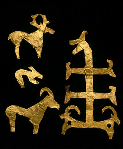 Verdenstræet i kors/galge format. 100 tallet e.Kr. Grav 46, Stanitsa Ust-Labinskaya, Krasnodarsky Kray (østkysten af Sortehavet, syd for Tanais-floden). Massivt guld, H: 12.6 cm, B: 6.8 cm. Billedkilde: Hermitage museet, St. Petersborg. Ver Asir/Danir-folket bringer derfor galgen (roden, trækorset) med sig under folkevandringen til vore nuværende landområder år 40-70 e.Kr. og det vi ved visuelt er sandt. Figurafbildningerne på 1. række af ”det korte” guldhorn tegnet af arkivar, kammerråd Jochum Paulli (1690-1759) 1734. Fra ”Danmarks Folk – I skildringer af danske videnskabsmænd” (1901, s. 221-222). Begge guldhorn blev fundet ved Gallehus ved Møgeltønder i Sønderjylland og er dateret til 400 tallet e.Kr. Dette er Sommersolhvervsafbildningen på ”det korte” guldhorn. Jeg har gengivet min fortolkning af de kunstneriske symboler, der her helt konsekvent i al vor kunst fra Stil I. De to dansende, og nøgne, krigere fra ErilaR (Jarl) æt er i den indledende del af ritualet omkring Sommersolhverv. Derfor mener jeg fisken og vildsvinet 1 skal vise det ”input” krigerne forsøger at modtage inden den shamaniske del af ritualet, der følger med den behornede shaman, den hellige edsring og askespydet som det symbolske verdenstræ. 1 Se også Beowulf-kvadet (sætning 303-4), samt afbildningen fra Sverige dateret til 700 tallet e.Kr. visende Odin med to hjælpeånder i form af vildsvin ”talende” til ham på hver side (se afsnittet ”Sakserne”). Snorre beretter i Snorre Edda (Skáldskaparmál, 43. Af smíðum Ívaldasona ok Sindra dvergs) om hvorledes Frey fik sit vildsvin: ”En Frey gaf hann göltinn ok sagði, at hann mátti renna loft ok lög nótt ok dag meira en hverr hestr ok aldri varð svá myrkt af nótt eða í myrkheimum, at eigi væri ærit ljós, þar er hann fór; svá lýsti af burstinni”. Som jeg oversætter til: ”Og Freyr gav han galten og sagde, at han [for]måede [at] rende luft og mellem brændinger nat og dag mere en hver en hest og aldrig være så mørkt om natten eller i Mørkets Hjem, at der ej være lys, hvor han fór; så lysende var børsterne”. Ulfr Uggason skriver i ”Húsdrápa” (vers 7): ”...Freyr ok folkum stýrir fyrstr hinum golli byrsta” Som jeg oversætter til: ”...Freyr og folket styrer først hin gyldne børste” Og hvor Freyr styrer ”hin gyldne børste” er netop til Sommersolhversbålet ”sonar báli” ([for]sonings-bålet), jvf. vers 8. Snorre skriver i Gylfaginning (kap. 49, Snorre Edda): ”En Freyr ók í kerru með gelti þeim er Gullinbursti heitir eða Slíðrugtanni” Som jeg oversætter til: ”Og Freyr kørte i kærre med galten der Gyldenbørste hedder eller Grumme Rugtand” I Hyndluljóð (vers 7, Ældre Edda) forklarer Freya os, i omtalen af at hendes mand Ottar den Unge, Innsteins søn1 er i Val-følget (valsinne): ”...þar er gaulltr gloar gullinbusti Hilldisuine,...” som jeg oversætter til: ”...der er galten[,] glimrer gyldenbørste hildesvin,...” At Ottar den Unge er i ”valsinne” (Val-følget) betyder han er død og undervejs fra rummet nutiden til rummet fremtiden, hvor Valhalla er. Dernæst skal vi have slået fast med syvtommersøm at ”gullinbusti Hilldisuine” ikke er Freya’s gyldenbørstede vildsvin. Alt hvad Freya forklarer os er at den faktiske konge Ottar den Unge er død og at han ledsages på sin rejse af et gyldenbørstet krigssvin. At vildsvinet kaldes ”Hilldisquine” forklarer os at Ottar den Unge døde i slag. At vildsvinet, som vi nu flere gange har hørt, gengives med en gylden børste, hvad svinet faktisk har, er i symbolik Ottar den Unges bålfærd. 1 I Hyndluljóð (vers 12, Ældre Edda) forklares ætten til ”Ottar unga, Innsteins bur” (Ottar den Unge, Innsteins søn): Ottar unga – søn af (ca. år 500) Innsteinn – søn af (ca. år 450) Aalfui enum gamla (Alf den Gamle) – søn af (ca. år 400) Vlfui (Ulf) – søn af (ca. år 350) Sæfara – søn af (ca. år 300) Suan enum rauda (Svan den Røde) (ca. år 200) Jeg mener at Hyndluljóð muligvis blev skrevet til Kong Haldan (Scyldinga-æt nr. 16, ca. 445-498)’s søn Áli/Authi/Auði. Jeg viser i afsnittet ”Götar-sønnerne Hygelác, Herebeald og Hæðcyn – sagnet om Balder og Höðr” at Svipdag = Óður, Óðr = Hædcyn = Höðr og at tiden er år 497-521 e.Kr. Mange foreslår at Ottar kan være identisk til Óður, Óðr. Tidsmæssigt passer dette glimrende og det er absolut ligeledes sandt at alle vore konger op til troskiftet år 600-630 e.Kr. er gift med Jord – Den Jordlige Moder (Freya, Gefion). Jeg tror dog vi her har en særskilt konge-æt, der helt ufatteligt giver os en konge-æt tilbage til ankomsttiden for denne gren. Grímnismál (vers 18, Ældre Edda) siger: ”Andhrimnir letr i Eldhrimne Sehrimni sodinn: flesca bezt, enn þat fáir vito, við hvat einheriar alaz” Som jeg oversætter til: ”Ånds-rim lader i Ild-rim Sø-rim1 syde: flæsket bedst, end da få vide, med hvad einherjar fødes” 1 oversættes også til ”sahrimnir, særimner, särimner”. Disse sætninger i Grímnismál er ufatteligt spændende og giver os en dyb indsigt i den vis ErilaR (Jarl) æt, der jo er ”einherjar”, tænker på. Ordet ”hrím” på oldnordisk har den dobbelte betydning som ”rim” og ”sod”, hvorfor vi ser ordet knyttet til ”ånd” og ”ild”. I afsnittet ”Gudinden Dísar” viser jeg hvorfor ”rimtåge” er knyttet til ”ånd”. Snorre bruger også megen krudt på netop disse linier, og fortolker dem i Gylfaginning (kap. 38, Snorre Edda): ”En aldri er svá mikill mannfjölðinn í Valhöll at ei má þeim endask flesk galtar þess er Sæhrímnir heitir. Hann er soðinn hvern dag ok heill at aptni. En þessi spurning er nú spyrr þú, þykki mér líkara at fáir munu svá vísir vera at hér kunni satt af at segja. Andhrímnir heitir steikarinn, en Eldhrímnir ketillinn. Svá er hér sagt:” 1 som jeg oversætter til: ”End aldrig er så mange ma