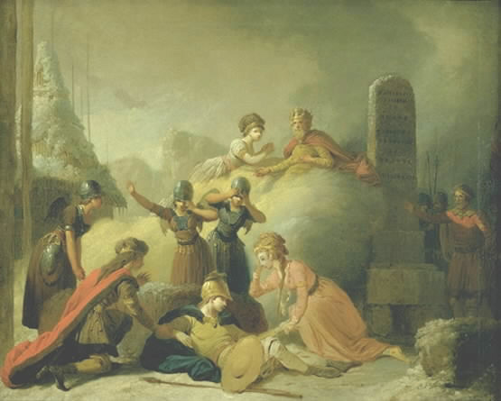 ”Slutningsscenen af Johannes Ewald s ”Balders Død”. Malet af Peter Cramer (1726-1782). Olie på lærred, 62,5 x 78 cm. Findes på Statens Museum for Kunst. Johannes Ewald (1742-1781) var digter med et alkoholproblem. Han blev 1773-75 anbragt på Rungsted Kro og skrev her syngespillet ”Balders Død” (1775), der først opførtes for en privat kreds, og senere i 1778 på Skuepladsen. Herfra maler Peter Cramer Slutscenen. Året efter, 1779, skriver Johannes Ewald teksten til ”Kong Christian stod ved højen mast”. Se også Snorre Sturluson’s beskrivelse af Balders død i Snorre Edda. |