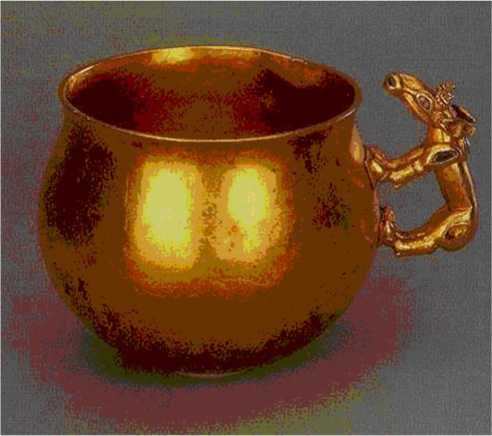 Dåbsgaven - den hellige kop Herodot forklarer os år 484-425 f.Kr (Bog 4:5), at Skythernes oprindelse skyldes 4 ting, der faldt fra skyerne: En gylden plov, et gyldent åg, en gylden krigsøkse og en gylden kop . Dette er en helt grundliggende indoeuropæisk forståelse. Vi kan se at koppen havde en særlig betydning, og at denne blev anset som hellig. Hellig Kop fra en sarmatisk grav dateret til det 1. århunderede e.Kr. (Khokhlach gravstedet nær Novocherkassk ved den nedre del af Tanafloden ). Har formentlig tilhørt en dronning af Aorsi -stammen (Ver Asir/Danir ). H 7.5 cm, diameter 9.2 cm i massivt guld. Denne samatiske kop har et håndtag udformet som en ung elg af yderst høj kvalitet. Dyreafbildningen er typisk sarmatisk og hovedet på dyret skulle altid være mod koppens kant for at beskytte dens indhold mod onde ånder. Billedkilde: Hermitage museet, St. Petersborg. |
