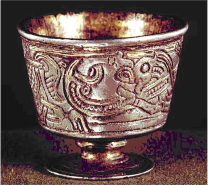 En Hellig Kop fra Hoby-gravfundet, Lolland dateret til år 0-100 e.Kr. Hoby-graven blev udgravet i 1920 tæt på den oprindelige bygd. Den midaldrende mand her begravet var høvding og graven indeholdt den uden sammenligning rigeste grav fra dette tidsrum inklusive 3 Hellige Kopper, hvoraf den ene er vist her. Identisk til den sarmatiske hellige kop ser vi dyrehovedet på koppens hank vende mod koppens kant for at beskytte dens indhold mod onde ånder. Billedkilde: Jørgen Jensen: Danmarks Oldtid (2003, Ældre Jernalder, 3. bind, s. 314). |