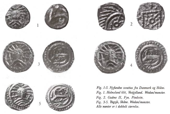 Gold scilling (oldengelsk) gull skillingr (oldnordisk) (gold shilling, guldskilling) slået i London ca. år 630 e.Kr. under Kong Eadbald, Konge af Kent år 616-640 e.Kr. Til venstre siger indskriften: AVDV (ARL ETH RE) GES eller ”af Kong Eadbald” På højre side: IIPNNHWL IENVS eller ”....nbal londenus eller ”for Eadbald, London.” Af de kun 5 fundne mønter af Eadbald er én beviseligt slået i Canterbury og de andre i London. Det antyder at Lundeborg/London starter op i dette tidsrum. Kilde: BBC. www.bbc.co.uk/history/lj/conquestlj/coin_1.shtml Guldskilling (kaldes af møntsamlere "guld tremissis") udstedt år 500-675 e.Kr. i Wic/Vic Pontio (Broen ved Vigen) ved Etaples, 27 km syd for Boulogne. Jeg mener disse mønter er udstedt år 587-670 e.Kr. Det fremgår af disse mønter på latin "INHV VIC PONTIO" og "DACVLFVSMNT" (møntet af Daculfus). Dette synes at være Frankernes hovedhandelsplads. Det er uklart for mig om "Wic/Vic Pontio" er identisk til bygden "Ponthieu" eller om den senere handelsplads fra ca. år 720 e.Kr. Quentovic blev lagt på samme sted. Handelspladsen "Quentovic" er sikkert sammensat af det keltiske "gwynt/gwent" (Wales/Bretagne) eller "vind", dvs. med den samlede betydning "Den Vindblæste Vig". Fundet i Barham ved Ipswich, Øst-Anglen. Registreret ved The Fitzwilliam Museum (EMC No. 2005.0102). Mønten er blot 1 cm i diameter, vejer 1.41 gram, og er derfor i størrelse typen der videreføres på sølvpenge. Der er to ting af yderste vigtighed på denne mønt, udover en fin afbildning af verdenstræet og de tre oprindelige verdener. Dels har vi under kongens buste handelspladsens mærke (se senere). Dels har vi måske kongens mærke ved hans mund; den nedadvendte trekant i prikker. Dette er Skjoldunge-ættens grundmærke givet til kvindelig side og hvorfra Ynglinga-ætten udvikles. Er dette en sand forståelse har Snorre ret da han i indledningen til Snorre Edda skriver at Skjoldunge-ætten sætter en søn som landeværner for Frakland. Min private samling. Det må derfor være rimeligt at antage at hængesmykket/amuletten fra Roskilde og fundene fra Ringe i virkeligheden er gull skillingr (guldskilling). Mange af hængesmykkerne er endnu ikke dateret. Mit gæt er at når der er generel accept af at disse enheder var gangbar mønt vil man hurtigt opdage at overgangen fra guld til sølv nøje følger overgangen i de nye kongeriger i Britannien fra Gold scilling til Seolfor pening år 670 e.Kr. Samme gør sig gældende hos Friserne i Dorestad og Domburg. Hvorfor kaldte vi vor første mønt for ”sciling/skillingr”? Ordet ”sciling/skillingr” oprinder formentlig fra roden ”*skel-” (at adskille) der igen er forbundet med ”scield/skjöldr” eller ”skjold”. Beowulfkvadet (sætning 47-48) forklarer os om Kong Skjold (scyldinga-æt nr. 13, ca. år 385-425 e.Kr.): Þa gyt hie him asetton segen geldenne heah ofer heafod, leton holm beran Som jeg oversætter til dansk fra Michael Alexanders nu-engelske oversættelse fra 1973: Da satte de for ham et gyldent banner /segl højt over hovedet, gav ham til tidevandet Vi kan her se at Kong Skjold har et gyldent mærke i mastetop. Saxo forklarer os at dette mærke er et gyldent skjold, symbolet på Skjoldunge-ætten år 385-425 e.Kr. Derfor kaldes de første mønter, sikkert slået under Kong Skjold, for ”sciling/skillingr”. Som det gyldne skjold er vort mærke, er også ”Gold scilling/gull skillingr” et symbol på Skjoldunge-ætten. Fra denne konklusion kan vi slutte af vore første mønter bliver slået år 385-425 e.Kr. eller umiddelbart efter vi har nogenlunde samlet kontrol over alle vore nuværende landområder. I Helgakviða Hundingsbana önnur (kap. 19) (Poetiske Edda/Ældre Edda) kvæder Guðmundur Granmarsson: "Hver er skjöldungur sá er skipum stýrir, lætur gunnfána gullinn gyr stafni?" Som jeg oversætter til: "Hvor er Skjoldungerne der skibet styrer, lader krigsfanen gylden (sidde) for stavnen?" Seolfor pening, silfr peningr, sølvpenge – SceatVi ved at i de nye kongeriger i Britannien erstattede Seolfor pening (sølvpenge) gold scilling (guldskilling) ca. år 670 e.Kr. Jeg er ganske sikker på at de mønter jeg nu viser under betegnelsen ”Sceat” 1 i virkeligheden bare er ”seolfor pening” eller ”sølvpenge” og at de kan dateres ganske nøjagtigt fra år 670 e.Kr. til første halvdel af 700 tallet e.Kr., formentlig til Pippin’s møntreform år 755 e.Kr. hvor den frisiske Wodan /Monster (Odin/Drage) type erstattes i Dorestad 2. 1 Sceat (ental), Sceatta (flertal) – det oldengelske ord for ”skat”. 2 Pepin Den Lille (The Short) (ca. 714-768). Pepin III. var Konge af Frankerne år 751-68 e.Kr., søn af Charles Martel og fader til Midgårdsormen selv, Charlemagne/Karl Den Store.