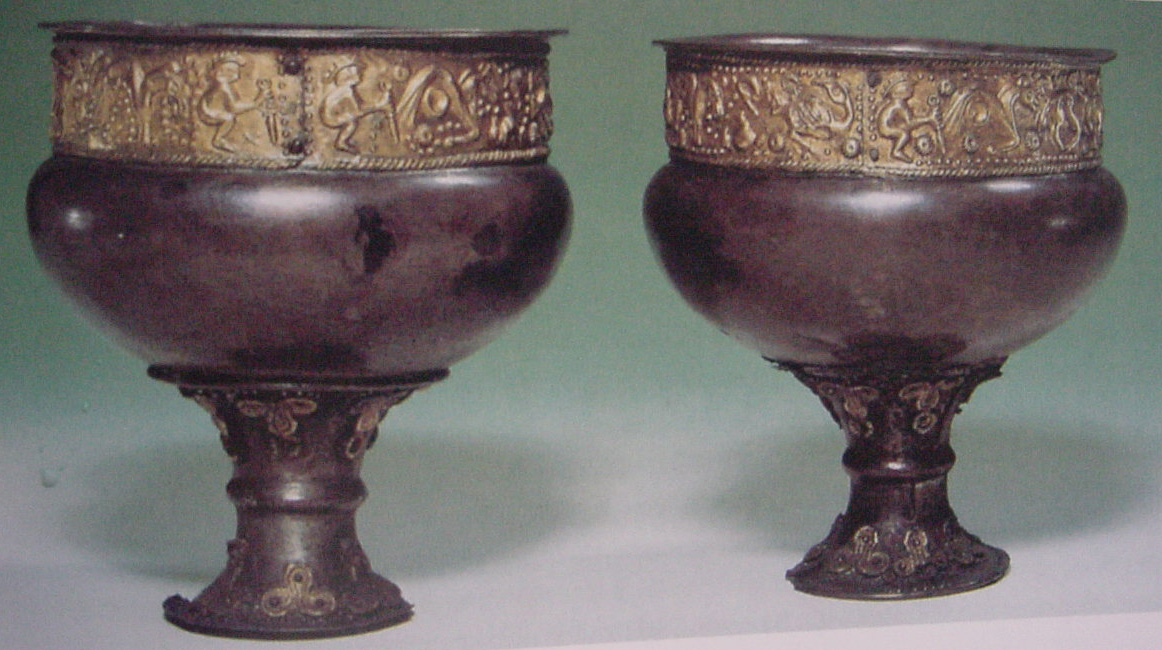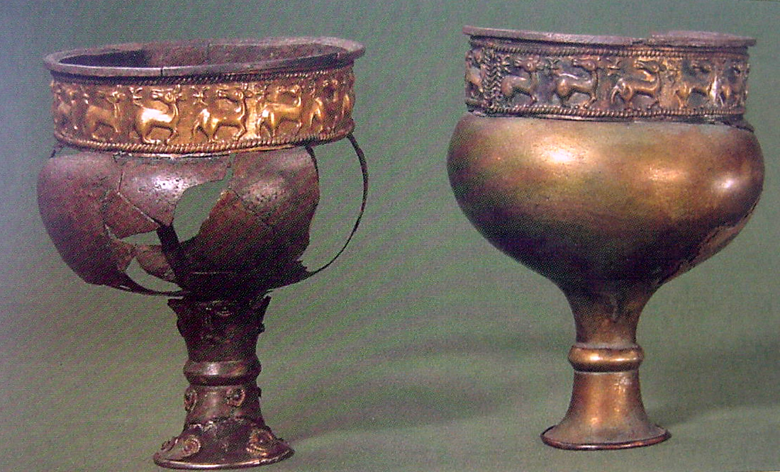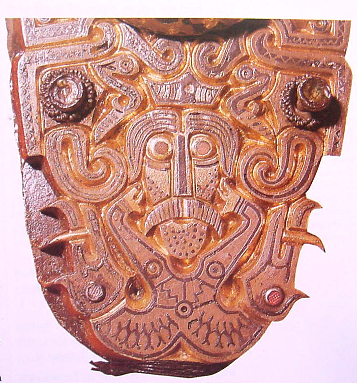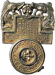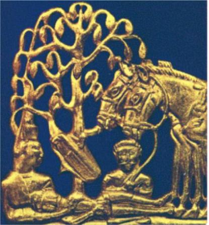 Bæltespænde dateret til 4-300 tallet f.Kr. gjort af guld. H:12.2 cm, L:15.5 cm, vægt: 464.85 g. En kriger af hankøn holder seletøjet på hestene, en kriger af hankøn ligger enten død eller er døende, og en kvindelig krigertempelpræst holder den liggende krigers hoved. Verdenstræet er helt dominerende. Er tilskrevet Sacae-kulturen (goterne), men den religiøse betydning er ikke fuldt forstået.Bragt fra Sibirien af Grev M.P. Gagarin til Peter I. i år 1715. Kilde: www.hermitagemuseum.org (Hermitage Museet, St. Petersborg)