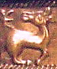 Nr. 4 nederst til højre: Kobbermønt fra 200 tallet e.Kr. møntet af Yaudheya-folket, der sideløbende med de gotiske Kushan-folk havde landområder i det nordlige Indien. Vi ved meget lidt om hvem de var. Påfuglen i profil ses ved det venstre ben (højre set fra læseren) af Kongen med scepter.