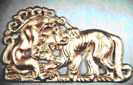 Bæltespænde gjort i guld. Dateret til 2-100 tallet f.Kr. Fra Mongoliet eller sydlige Rusland. 6.7 x 7.9 cm. Viser to store katte (hunløver?) i kamp med to stenbukke (de buede sider øverst er stenbukkenes horn). Kaldes en Xiongnu type, dvs. stammer fra Hunnerne. Dette spænde kan nemt være sarmatisk og vi genser den fordrejede dyrestil i begge stenbukkene. En gave fra J. Pierpont Morgen til The Metropolitan Museum of Art, New York 1917 (katalognr. 17.190.1672).