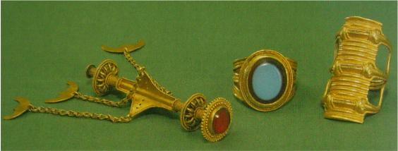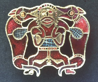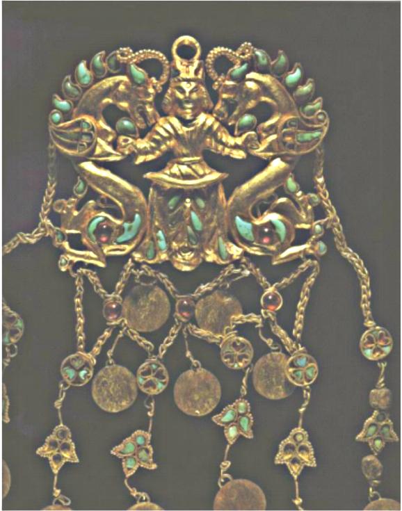 Smykke fundet i 1978 i Tillya Tepe i det ekstrem nordlige Afghanistan mellem Hindu Kush og Amu Darya floden. Dateret til år 100 f.Kr. 12.5 x 6.5 cm. Vi ved ikke hvem der har kontrol med området i samtiden. Smykket kan være gotisk fra Kushan riget, men kan også være fra vor egen stamme da vore græsegne strakte sig til dette område. Kunststilen er sarmatisk. Vi ser helt tydeligt en kvindelig krigertempelpræst med to drager ”talende” som hjælpeånder til kvinden, der derfor ”kan den vaniske trolddom” og er shaman. Kilde: Jeannine Davis-Kimball: Warrior Women (2002, s. 182) Archaic Proto-Bactria and Early Ancient Bactria (http://www.hp.uab.edu/image_archive/ucd/) |