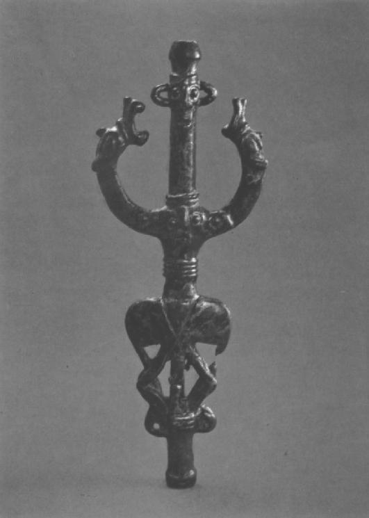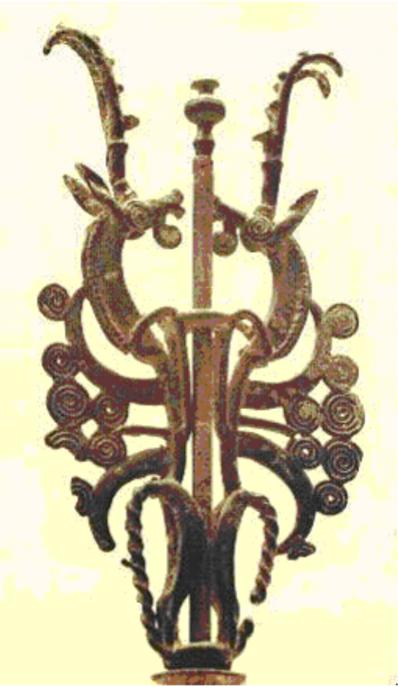 For at give et par eksempler på vor urgammel vor verdensforståelse for at Shamanen henter råd og vejledning fra Hjælpeånder er, vises to toppe fra bannerbærere fra Luristan, nuværende vestlige Iran. Eksemplet til venstre fra Hermitage, St. Petersborg er dateret til 7-600 tallet f.Kr. Eksemplet til højre er dateret til ca. 900 f.Kr. |