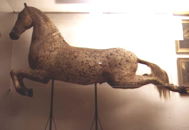 Til venstre: Hingst af Frederiksborgrace. Hesten løb i 1683 strækningen København-Hillerød på 42 minutter, men faldt død om efter præstationen (prøv at eftergøre denne præstation i bil i myldretid!). Den blev udstoppet i en springstilling (capriolestilling) og sat på Kunstkammeret.