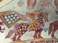 Til højre: Statuen midt på Amalienborg slotsplads er kendt som Saly's rytterstatue. Det tog den franske billedhugger Jacques Francois-Joseph Saly godt 20 år at skabe statuen, der i dag regnes for en af Europas berømte rytterstatuer. Monumentet forestiller Frederik V, blev afsløret i 1771, og viser en kongen på en Frederiksborghest. Vi ser på kalkmalerierne fra Middelalderen bl.a. afbildninger af røde heste med hvide prikker. Det forekommer mig at disse i samtiden kan have været kendt som ”Dannebroget/Danbroget” heste. Ovenfor til venstre: Skibby Kirke, Horns Herred , Frederiksborg Amt. Kalkmaleri dateret til år 1350 e.Kr. Ovenfor til højre: Vægtæppet fra Baldishol stavkirke, dateret til 1100 tallet e.Kr. Hænger nu på Kunstindustrimuseet i Oslo. Nedenfor til venstre: Kalkmaleri i Vesterø Kirke på Læsø dateret til år 1500-1525 e.Kr. Nedenfor i midten (øverst): Kalkmaleri i Kirke Såby Kirke, Roskilde Stift dateret til år 1410-1425 e.Kr. Nedenfor i midten (nederst): Kalkmaleri i Fårevejle Kirke, Roskilde Stift dateret til år 1525 e.Kr. Nedenfor til højre: Kalkmaleri i St. Hans Kirke, Stege, Møn dateret til år 1476-94 e.Kr. Billedkilder: http://www.kalkmalerier.dk/ og John Grant: Viking Mythology (1990, s.31)).  |