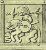 To ryttere fra Væringe-gardens rytteri i Miklagarð. Afbildningen er på silke og dateret til 700 tallet e.Kr. Udover de enorme lanser, bemærk det meget fine seletøj og sadeldækken, som den militære lærebog foreskrev. Rytterne bærer klart uniform, og begge gør brug af stigbøjler der, som vi har hørt, er foreskrevet i den militære lærebog. Jeg har fremhævet én af disse stigbøjler, der fremstår som gjort i vandret D-form. De to ryttere angriber 2 løver, der samtidigt angribes af 2 jagthunde. Afbildningen viser den oprindelige jagt. Rytterne gør ikke brug af sporer, og ser ikke ud til at have sværd på sig, formentlig fordi der her er tale om en jagt. Billedkilde: David Talbot Rice (1903-1972): Art of the Byzantine Era (1. udgave 1935 m. titlen "Byzantine Art", 1985, Illustration 59, s. 71) Da vi ved at guldskillinger erstattes af sølvpenge år 670 e.Kr., og da stigbøjler ikke forekommer på guldskillinger, kan vi sige at stigbøjlen ikke er indført nord for Ejder-strømmen før efter år 670 e.Kr. Først fra tidligt i 700 tallet e.Kr. begynder vi at finde stigbøjler som en del af den højsatte's rideudstyr i vore landskaber.  |