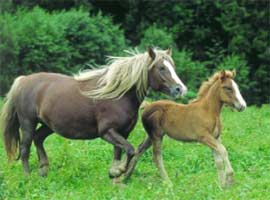 Den islandske Hest fra Han Herred Ridecenter ved Gitte & Peter Philipsen. Hesten ses her i gangarten Tölt , som nok er den gangart vi alle forbinder med hesten. Gangarterne ("göngulags" oldnordisk, "gonguløg" færøsk, "gait" nuengelsk) Tölt (”rack” nuengelsk) og Skeið (”pasgang” nudansk, ”pace” nuengelsk) er særlige for denne hest, der derfor behersker 5 gangarter (de andre værende skridtgang, trav og galop). Michael Lerche fra Institut for Navneforskning har forklaret mig at gangarten ”Tölt” i sin grundbetydning oversættes til ”at bevæge sig”. Gangarten Tölt er beskrevet som ”en bemærkelsesværdig jævn, firtaktsgangart, hvor fødderne bevæges efter samme mønster som i skridtgang. Ryttere finder denne gangart meget behagelig - den giver dem en følelse af næsten at svæve i luften”. Vi kan ligefrem se for os kvindelige ryttere i svaneham flyvende gennem luften – vi kalder dem engle, senere valkyrjer. Det er her vigtigt også at fremhæve Den færøske Hest (Føroyska rossið, Færø hesten). Med et stangmål på 120-132 cm er denne hest naturligvis meget lig Den islandske Hest, men er DNA bestemt som en særskilt lidt mindre type med blod fra britiske heste. Hesten ankommer til Færøerne i landnámstiden i 800 tallet e.Kr. Grímur Kamban's landnám er efter år 825 e.Kr. og hans keltiske efternavn, giver måske et spor i forståelsen af hvilke heste der blev indført i disse tidlige år. Hesten er stadig udrydningstruet og der findes i dag under 100 dyr i stammen.  |  |