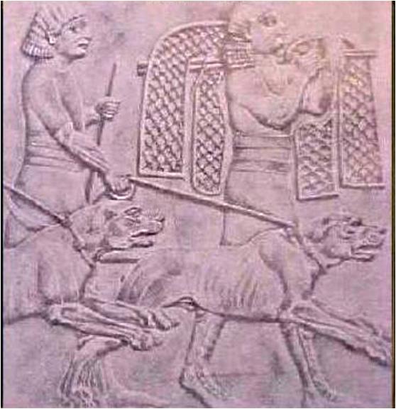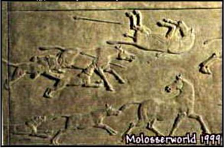 Billederne er fra British Museum i London udgravet ved byen Nineveh i halvmånedalen i Mesopotamien. Denne by blev etableret omkring år 700 f.Kr. som afløsning for byen Assur, der blev ødelagt år 614 f.Kr. Begge basrelieffer er fra 700-600 f.Kr. Billedkilde: British Museum og Molosserworld. De store hunde i Asien/Midgård – år 480-326 f.Kr.