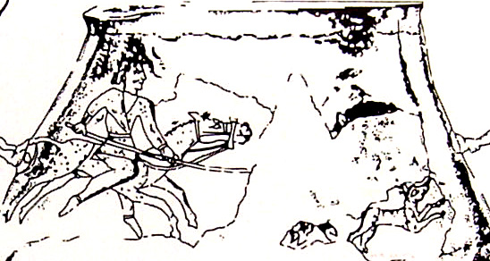 Fordi vi kan sammenholde de store jagthunde med hesten og en ung mand er vi ikke i tvivl om at dette er absolut enorme jagthunde til vildsvinejagt, og derfor en af forfædrene til Den danske Hund. Vi bemærker også tilstedeværelsen af Harlekin-typen. Halsbåndene viser at hundene er tæmmet til jagten. Tiryns nævnes af den græske geograf Pausanias i hans værk ”Beskrivelse af Grækenland” fra 100 tallet e.Kr. I hans samtid findes kun Tiryns bymur tilbage (8.33.3 og 9.36.5). Det siges at bymuren var 6-7.5 meter tyk. Byen deltager på den angribende side i Slaget om Troja under ledelse af Diomedes, jvf. Homer: Iliaden (bog V: 440). Det siges at Diomedes havde 80 skibe i sin flåde med til Troja, dvs. helt uden for tvivl er det Søens Folk, der drager fra denne by. Brødrene Menelaos og Agamemnon, søn af Atreus, er fra Danaan-folket, som jeg mener er identisk til Bronzealder "Tani" (Daner)-folket. Agamemnon fulgte faderens fodspor og blev hersker over Mukēnē (Mykênê) og landskabet Argos. Billedkilde: National Archeology Museum, Athen