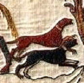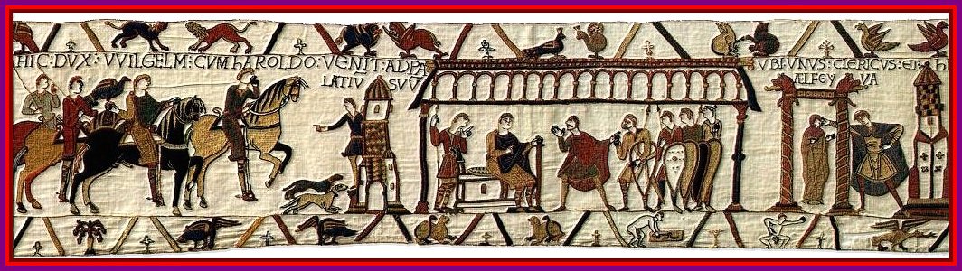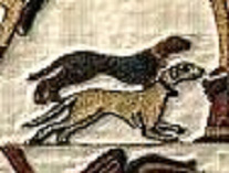År 912 e.Kr. fik Hrolf der Ganger ”Rollo” tildelt Normandiet af Frankerne som Danegeld for ikke at afbrænde Paris. Derfor kommer Den Store Hund til Normandiet med Rollo og hans følge. Hertug William er 5. slægtsled efter ”Rollo”. Bayeux gobelinen beskriver i helt utrolige detaljer optakten til og selve Slaget ved Hastings 14. oktober år 1066 e.Kr. mellem Hertug William af Normandiet og Kong Harold Godwinson. Denne 70 meter lange gobelin blev lavet under opsyn af biskop Odo, halvbroder til Hertug William af Normandiet, umiddelbart efter selve slaget i perioden 1066-77 e.Kr. Scenerne nedenfor foregår år 1064 e.Kr., 2 år før selve Slaget ved Hastings. Den engelske konge Edward the Confessor havde dette år fortalt Jarl Harold at han skulle rejse til Hertug William i Normandiet og lenshylde ham, dvs. underkaste sig William’s overherredømme, og bekræfte aftalen mellem Kong Edward og Hertug William indgået år 1051 e.Kr. om at Hertug William skulle blive Konge af England når Edward faldt bort. Harold tager ganske vist til Hertug William som vi ser ovenfor, men lader sig senere krone til Englands konge. Det er denne handling der udløser Slaget ved Hastings. Der er 35-55 hunde afbildet på gobelinen, afhængtigt af hvem der tæller. Ingen hunde er afbildet under selve slaget og eksempler på de store hunde er vist i optakten til slaget under jagtscener.  |