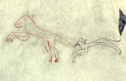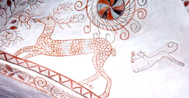Kalkmaleri fra Hyllested Kirke, Djurs Sønder Herred dateret til år 1500-1520 e.Kr. Den Store Hund ses her med halsende tunge jagende ræven. Hunden har halsbånd på med udadvendte pigge. Kilde: www.kalkmalerier.dk ”Naar Nogen har Lede til Mad, saa at han ikke kan spise, da skal han gaa til Hundehuset, og medens Hunden æder, selv spise lidt af Truget, saa vil han derefter faa Madlyst” 1. 1Se J. M. Thiele: Danmarks Folkesagn (1860, 3. Deel, s. 115, nr. 501). Thiele henviser også til Peder Nicolai Skougaard: Beskrivelse over Bornholm (1804, s. 79). ”Paa Bornholm, hvor denne Sygdom kaldes ”Madale” bruger man samme Middel”.