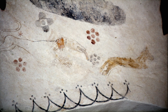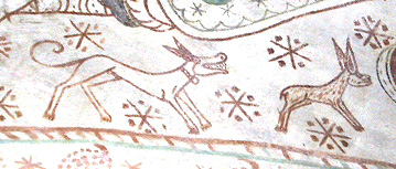 Kalkmaleri fra Gislev Kirke, Gudme Herred på sydøst Fyn dateret til år 1500-1525 e.Kr. Læseren skal lade øjnene hvile på dette ekstremt vigtige kalkmaleri et øjeblik. Herefter træder 5 hunde tydeligt frem og vi ser formentligt alle varianter af jagthundene i samtiden fremstillet. Yderst til venstre er Den Store Hund, og den er kæmpestor, med halsbånd og i snor, hvilket ikke alle hundene er vist med. Vi ser også at 2. hund fra oven ikke har kuperede ører og virker som en anden slags hund, måske en ”Englandshund”?. 3. hund fra oven synes tillige at være Den Store Hund, men er en anden variant, ihvertfald i ansigtet. Dette kan indikere en Blending selvom de kongelige jagtprotokoler ikke omtaler at ”Englandshundene” bliver indført før år 1585 e.Kr. Kilde: www.kalkmalerier.dk