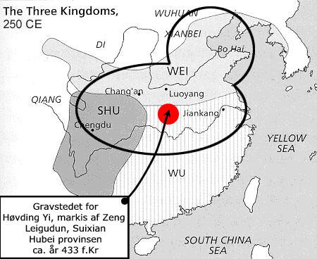 Min oversættelse til nudansk. Hvad gør Dragebåden værdifuld i historisk øjemed er at der med det årlige ritual også medfølger krav fra oldtiden mht. bådens konstruktion. Som følge deraf er den nuværende form derfor meget lig hvorledes den har set ud i år 278 f.Kr. Dette gør den samtidig med Hjortspringsbåden, jordet ca. år 350 f.Kr. Øverst ses udformningen af en Stanley Mellemstørrelse båd (11.66 m lang, 1.06 m bred, 0.43 m dyb. 20 personer). De største både er 37 meter lange. Nederst ses Hjortspringbåden (14 meter lang med plads til 16-17 personer). Dette har været basisudgaven af en flodbåd brugt til handel, transport og muligvis krig. Nu tager vi et spring på omkring 500 år til år 310-320 e.Kr., hvor vi har Nydam-skibet, fundet i august 1863 i Nydam Mose, Slesvig. Til venstre: Nydam-skibet fra år 310-320 e.Kr. i egetræ med styrbords styreåre. Til højre: Et tilsvarende klinkerbygget skib under Tang-dynastiet (år 618-906 e.Kr.), igen med styrbords styreåre. Skibstypen kaldes på engelsk "Sea Hawk" (Sø-høg). Skibstyperne er identiske. Den kinesiske junke-konstruktion begynder først i Song-dynastiet (ca. år 960-1270 e.Kr.), hvor de bygger store oceangående handelsskibe. Op til dette tidspunkt ligner deres skibe til forveksling vore langskibe. Billedkilde: Danmarks Folk – I skildringer af danske videnskabsmænd” (1901, W. Dreyer: Nordens Oldtid, Jernalderen, s. 215-216). I 1977 gjordes et arkæologisk fund i Leigudun, Suixian i Hubei provinsen i det centrale Kina, der efter min mening er utrolig vigtig at forstå. Hubei provinsen ligger lige vest for Shanghai med Han og Yangtze floden flydende igennem landområdet. Gravfundet er enormt 1, og har så stor variation, at vi kan drage konklusioner fra nogle af de fund jeg viser nedenfor. Indskrifter på nogle af bronzegenstandene antyder at den gravlagte høvding var Yi, markis af Zeng (”Zenghou Yi” på mandarin) og at graven kan dateres til ca. år 433 f.Kr. 2 Tidsrummet er derfor i ”De Stridende Staters Periode”, ca. år 475 f.Kr.-221 e.Kr. Gravfundet er udstillet på Hubei Provincial Museum. Man kendte indtil 1977 ikke til eksistensen af en stat ved navn ”Zeng” og derfor er al viden om hvem dette folk og denne høvding var, ukendt. Netop det manglende kildemateriale om denne stat er i sig selv ganske bemærkelsesværdigt, og skyldes næppe at de kinesiske historieskrivere ikke kunne deres håndværk. Langt de fleste arkæologiske fund fra gravstedet er tydeligt præget af traditionel kinesisk håndværkskunst (fra staten Shu/Chu – se kortet nedenfor) med meget komplicerede udskæringer af meget høj håndværksmæssig kvalitet. Dog er mindst tre af fundene radikalt anderledes fra resten af de fundne genstande. 1 124 musikredskaber, 134 bronze genstande, 4.777 våben, 1.127 bronzedele til stridsvogne, 25 læderharnisk, 5.012 lakerede genstande, 26 bamboo genstande, 5 guld genstande og 4 guld bæltespænder, 528 jade- og stengenstande, 6.696 kinesiske skrifttegn skrevet i blæk på bamboo. 2 Graven er 21 m lang, 16.5 m bred, 13 m dyb og dækker et areal på 220 m². Der er 4 gravkamre. Det østlige kammer indeholdt høvdingen selv, 8 unge kvinder og en hund i sin egen kiste. Gravkammeret i midten menes at være en ceremoniel hal. Det nordlige kammer indeholdt alle våben og det vestlige kammer indeholdt 13 yngre kvinder, formentlig tjenestefolk. Høvdingen ligger helt åbenlyst begravet i det østlige kammer fordi Solen står op i øst. Høvdingen har fulgt solgudsskikke identiske til vore egne og har ønsket at være tættest på Solen. At han er begravet med sin hund , og at hunden var så højt vejrsat at den får sin egen kiste, er chokerende lig hvorledes vi selv gravlage vore Dronninger og Konger efter ankomsten til vore nuværende landområder. Kort over Wei, Wu og Shu kongerigerne = de 3 kongeriger. The Cambridge Illustrated History of China. London: Cambridge University Press, 1996, s. 87 Kilde: http://www.threekingdoms.com/ Til venstre: Det Store Dyr. Den ovenfor viste Kronhjort blev fundet i Markisen’s gravkammer og har derfor nok tilhørt ham personligt. Hovedet kan drejes og hornene er ægte. At høvdingen har Det Behornede Dyr ved sin side skyldes, jvf. vor egen forne sæd, at høvdingen’s rejse til den næste verden alene kan ske under beskyttelse fra Det Store Dyr, der kan være hesten og behornede dyr som rensdyr, hjort og elg. Denne verdensopfattelse er udelukkende indoeuropæisk. Til højre: Den Hellige Kop. Gjort af guld og 11.1 cm høj. Som er tilfældet med Det Store Dyr, lå også Den Hellige Kop i Markisen's gravkammer og har tilhørt ham personligt. Koppen er i udformning, også i forhold til alle andre fund fra gravstedet, ekstrem simpel. Identisk med vore egne skikke, skulle den gravlagte have sin hellige kop med sig til den næste verden. Kilde: Professor Patricia Buckley Ebrey, Department of History, University of Washington. http://depts.washington.edu/chinaciv/contents.htm Endelig har vi fundet af en lille æske udformet som en skibsand. Skibsanden er gjort af lakeret træ og er 20.1 cm x 16.5 cm. Låget (andens vinger) kan tages af og hovedet kan drejes. Herefter fremkommer en perfekt stavn (andens hals og hoved) hvor andens hoved symboliserer dragehovedet. Der er ét øje på hver side da disse øjne, hos kineserne og hos os, skulle beskytte mod onde ånder. Skibsanden blev fundet i det vestlige kammer sammen med de 13 yngre kvinder, der menes at have været tjenestefolk. Overfladen er sortlakeret. Detaljerne er malet med rød og gul maling. Kilde: Professor Patricia Buckley Ebrey, Department of History, University of Washington. http://depts.washington.edu/chinaciv/contents.htm Forstørrelse af samme skibsand, hvor afbildningen af Drageskibet og dragehovedet fremhæves. Dette er forløberen til Nydamskibet. Vi ser Dragehovedet og Det Behornede Dyr til venstre gjort identisk til den kunststil vi i Danmark kalder Nydamstil/Stil I. Det Behornede Dyr er a