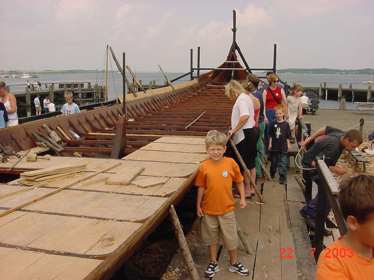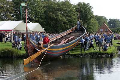Bådeværftet på Vikingeskibsmuseet, Roskilde 22. juli 2003. Christian’s ansigtsudtryk viser en sødaner klar til kamp, ikke at vejret var koldt. Skuldelev 2 er et langskib på 30 meter. Ved siden af Christian ses kølsvinet, dvs. midtskibs. Det øverste bord er endnu ikke sat på plads. Et imponerede Drageskib. Søsætningen lørdag d. 4. september 2004. Navngivet ”Havhingsten af Glendalough” af HM Dronningen efter byen i Irland, hvorfra træet til Skuldelev 2 menes at oprinde. Kilde: Berlingske Tidende. Billede taget af Keld Navntoft. Se glimrende kortfilm om langskibet her: http://www.havhingsten.dk/index.php?id=446&L=1 Drageskibet Ormen Hin Lange er uden sammenligning verdens mest kendte langskib. Det omtales i Heimskringla, Olav Tryggesøns (Olav Tryggvason) Saga, kap. 54. Drageskibet blev år 1000 e.Kr. bygget på stranden kaldet Ladehammeren (Hlaðhömrum) i Nidaros nær Trondheim. Skibsbyggeren var Olav Tryggvasons byggemester Þorbergur Skafhögg (Torberg Skavhug eller Hårkløver). Historieskriveren ser fysisk skibet på bedding, måske i samme tilstand som billedet ovenfor viser, og forklarer os at længden var ”fjórar álnar hins átta tigar” (4 alen af den 8. gruppe af ti), ”og bredt var det i Forhold, højt var Skroget, og Tømmeret ført til Stavns”. Ganske interessant er selve Dragehovedet medbragt af Olav Tryggvason fra en rejse til Helgenland (Hálogalandi), og altså ikke gjort lokalt. Skibet var bygget efter et tidligere skib der må have været mindre, for det kaldes i sammenligning ”Kort Ormen” (Orm hinn skamma)1 mod det nye der kaldes ”Lang Ormen” (Orm hinn langa). 1 Bent og Erik Andersen forklarer i ”Råsejlet – Dragens Vinge” (s.25) at Olav Tryggvason en eftersommer år 995 e.Kr. ombord på sit langskib Tranen sejlede inden om storbonden Raud den Ramme på Godøy i Saltfjorden. Raud den Ramme har et Drageskib på 30 rum og da Raud ikke vil lade sig kristne, dræber Olav ham, hugger hans skib og drager hjem til Nidaros/Trondheim ”for det var et meget større og smukkere skib end Tranen.” Dette skib kalder Olav for ”Ormen” ”for når sejlet i luften, var det som at se Dragens vinge” (Heimskringla, Olav Tryggesøns Saga, kap. 49). For så vidt angår længden så har vi fire forskellige versioner af dette: 14 Alen på den fjerde Snes (Grundtvigs oversættelse fra 1879) 74 alen (engelske oversættelser) fjórar álnar hins átta tigar (4 alen af den 8. gruppe af ti) (oldnordisk) Flateyjarbok (spalte 244 og 245) siger følgende om Ormen Hin Lange (Bent og Erik Andersen’s Råsejlet – Dragens Vinge, Vikingeskibshallen i Roskilde, s. 37): ”Ormrin hafdi fiogur rum1 hins fiorda tigar en kiolr hans var fiorar alnar hin otta tigar græslægr, en pat var æigi med alnum talet er til stafna uisse” Der oversættes til: ”Ormen havde 34 rum1 (4 rum af den 4. gruppe af ti), og hans køl var 74 (4 alen af den 8. gruppe af ti) alen græslagt, og det er med sikre underretninger uden stævnene.” 1 Et rum er afstanden mellem to band (spant) og som regel samtidig mellem to rorbænke, der også benævnes "sesse" eller "þopta" (tofte). Her tror jeg her at Grundtvig foretager en forkert oversættelse. Han læser ”fjórar” (4) som ”fjórtán” (14) og omskriver herefter korrekt ”8 gruppe af ti” til ”4 snese”. Hvordan det kryptiske ”fjórar álnar hins átta tigar” skal fortolkes er ikke nemt at sige, og uden tvivl årsag til megen kontrovers. Mit bud er at det betyder (8 x 10) – 4 eller 76 alen. Dette synes dog ikke at være den eksisterende opfattelse, og forskere oversætter ”fjórar álnar hins átta tigar” til ”74” og ”fiogur rum hins fiorda tigar” til ”34”. Dette kan jeg ikke grammatisk forklare eller forstå. Oldnordisk ordbog skriver at en islandsk alin var ½-¾ af en alen fra det sydlige Danmark. Ole Rømer fastslog ved Chr. D. V’s forordning af 1. maj 1683 at 1 alen = 2 fod. Vi ved at 1 fod ved bygningen af Hovedvolden i Danevirke var 30,95 cm i år 737 e.Kr. Derfor er 1 alen fra det sydlige Danmark i 700 tallet 61,90 cm. 75% af dette giver 46,42 cm. Bent og Erik Andersen forklarer i ”Råsejlet – Dragens Vinge” (s.49) at den gamle ”trønderske” (nordlandske) bådalen var 55.3 cm. Bruger vi den nordlandske bådalen er Ormen Hin Lange derfor enten 41 meter (ifald 74 alen er korrekt) eller 42 meter (ifald 76 alen er korrekt). Erik Andersen fra Vikingeskibsmuseet mener at længden er indenfor 46 meter og 35 rum, dvs. 70 årer med et bud på 42 meter som realistisk. Han gør iøvrigt opmærksom på at man ikke inden for skibsbygning brugte enheden ”fod” ligesom man ikke havde 2 fod = 1 alen, og at Ormin hin Lange var et letbygget fleksibelt langskib, hvor ro-egenskaberne var højt prioriteret, modsat de sværtbyggede langskibe vi ser fra år 1180 e.Kr. I afsnittet ”Vendertogene år 1158-1185 e.Kr.” har jeg vist hvorledes Heimskringla (Gillunga Saga, kap. 19) forklarer os at Kong Inge år 1157 e.Kr. har et slag med Kong Ejsten/Eystein Magnussøn, hvorunder sidstnævntes Drageskib tages krigsbytte, og gives som gave til Valdemar I. den Store. Fra samme beretning hører vi at Ejsten Magnussøn lader sit Drageskib ligge ”fordi den var saa svær at ro.” (Heimskringla, Gillunga Saga, kap. 19). Drageskibet er med andre ord imponerende, men i praksis for stort. Mon ikke det er derfor at Knýtlinga saga (s. 333) forklarer os om Valdemar’s Drageskib, som han gør brug af under det 2. Vendertog år 1159 e.Kr., og som muligvis er en kopi af Ormen Hin Lange, at ”paa denne Reise fik han Dragen beskadiget”. Valdemar’s Drageskib var bemandet med ”roskildske søfolk” og blev leveret til Valdemar ved ledingsflådehavnen i Isøre ved indsejlingen til Roskilde Fjord. Højbådsmanden hed Astråd (bog 11:75). Det næste Land er i Havsnød immer det bedste (DRK 4:65) I ”Bilag Ø: Forne sange” gengives folkevisen ”Ormurin Langi” fra Færøerne.