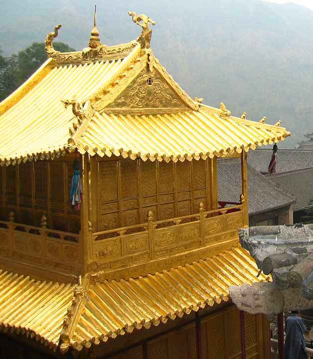 Tempel bygget udelukkende af bronze, hvorefter det enten er malet eller forgyldt. En del af Xiantong Si templerne, Kina. Var det således vore høvdingers store hal blev tækket? Om Heorot havde forgyldt spån eller kobbertag skal jeg lade være usagt. Vi ved at Det Gyldne Segl – Vejrfanen blev gjort af forgyldt kobber og sat i stavn eller mastetop på Drageskibet. Bemærk i øvrigt de beskyttende dragehoveder, der beskytter templet. Dragehovederne på de norske stavkirker er identiske, tjener samme formål og har samme oprindelse. Kilde: http://www.doncroner.com/China/Wu-Tai/Wu-Tai.html |