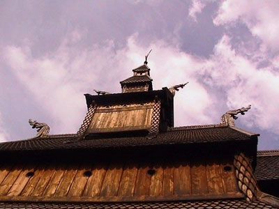 Hopperstad stavkirke, Vik sogn. Dateret til sidste del af 1100 tallet e.Kr. Vi bemærker de 4 dragehoveder, der med ryggen til forsvarer helligdommen. Kilder: Grundoplysninger fra Jørgen Jørgensen: http://home.online.no/~jorgenj/ Billedet taget af T.V. Stenersen, 27. juni 2003. Nan Chan Si, hvor ”Si” betyder ”tempel”, Wu Tai Shan, Shanxi provinsen, det nordvestlige Kina. Vi ser her selve hallen. Templet er åbenlyst restaureret, i hvilken grad ved vi ikke. Templet blev bygget i år 782 e.Kr. under Tang dynastiet (618-906 e.Kr.) og er det tidligst kendte nuværende eksempel på et tempel bygget af træ. Vi genser igen de to beskyttende drager på toppen af gavlen, identisk til placeringen på norske stavkirker. Som på det forgyldte bronzetempel i Xiantong er tagudhængets krumbøjning langt mindre end vi ser senere, og derfor sikkert tættere på hvorledes tagene oprindeligt tog sig ud inden den buddhistiske indflydelse bliver større. Kilde: Huntington Archive Image Scan C9011, 1982.