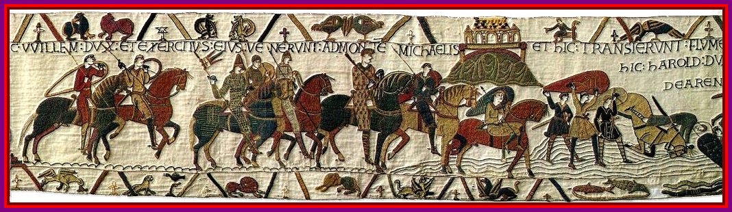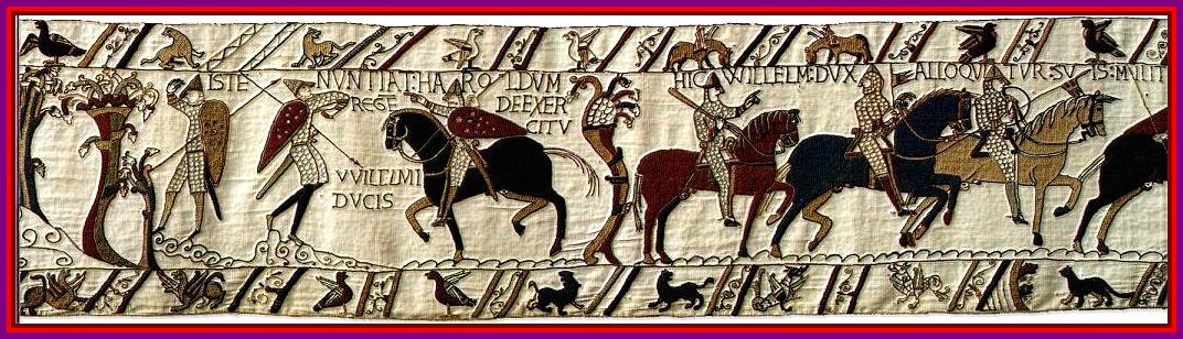 Bayeux gobelinen, der i helt utrolige detaljer beskriver optakten til og selve Slaget ved Hastings år 1066 e.Kr. Denne 70 meter lange gobelin blev lavet under opsyn af biskop Odo, halvbroder til Hertug William af Normandiet, umiddelbart efter selve slaget i perioden 1066-77 e.Kr. Hic Willelm Dux et exercitus ejus venerunt ad montem michaelis. (Her Hertug William og hans hær kom til Mont Skt. Mikael) Kilde : http://hastings1066.com/baythumb.shtml (tapestry nr. 9) I forstørrelsen af banneret fra ovennævnte del af gobelinen kan vi se at Hertug William’s bannermester helt uden for tvivl rider med The Cross of St. George med ravnestyrevinger 1. Da Hertug William senere i gobelinen modtager nyheder om Harold medens William ligger i lejr i Hastings ser vi William siddende på tronstolen med samme banner i hånden. Banneret der derfor helt sikkert Hertug William’s personlige banner (se tapestry nr. 24). 1 Den engelske skabelsesmyte siger at Richard I the Lionheart (regent 1189-1199) bringer The Cross of St. George til England omkring år 1190 efter have set det i en drøm, selvom det først ses på engelske skibe fra år 1284. Da Hertug William stikker i søen over den engelske kanal på vej mod Hastings vajer et korsbanner fra mastetoppen på hans Drageskib. I afsnittet "Skibstyper år 800-1300 e.Kr." viser jeg at vi klart kan se at dette banner er The Cross of St. George. Hic Willelm Dux Alloquitur suis militibus ut prepararent se viriliter et sapienter ad prelum contra anglorum exercitum. (Her Hertug William formaner sine hærmænd at forberede sig som mænd og med visdom til slaget mod Anglernes hær) Kilde : http://hastings1066.com/baythumb.shtml (tapestry nr. 27, 28 og 29)