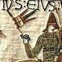 Nederst en scene fra Bayeux gobelinen fra år 1066-77 e.Kr. Den latinske tekst lyder : Vbi : nvntii: willelmi: (hvor [hertug] William’s sendebud…). De to sendebud fra hertug William til højre er ankommet til hest til grev Guy I. til Ponthieu’s hjemby Beaurainville, og anmoder grev Guy’s livgarde til venstre om at frigive den tilfangetagne Harold Goodwinson. I år 1064 e.Kr som Jarl af Wessex havde han lidt skibbrud på Ponthieu’s kyst. Hertug William løskøbte Harold Goodwinson. Grev Guy (kaldes Wido på Bayeux gobelinen)’s livvagt ses med Daneøksen.