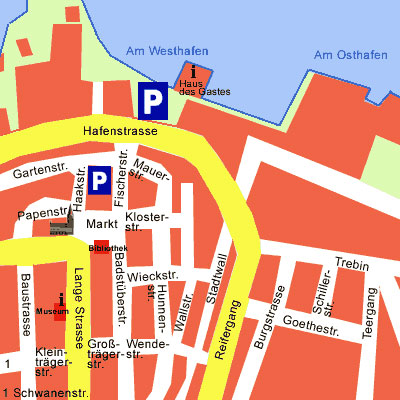 | Bykort over den gamle bydel i Barth. Under det øverste P-skilt ser vi "Mauer strasse" og her har bymuren ligget. Vej nr. 2 hedder "Wieck strasse" eller "Vig stræde". Den tredje vej under denne hedder ”Wende strasse” eller ”Vender-stræde”. Byen fejrer år 2005 sit 750 års jubilæum, og regnes derfor for officielt grundlagt år 1255 e.Kr. Dette er naturligvis ikke korrekt og er datoen Rygenfyrsten Jaromar II. tager kontrol med bygden. Kilde: www.stadt-barth.de