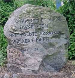 Iflg. Saxo bog 11:23 angreb Venderne, nok et par enkelte skibe (Saxo skriver 24), i nærheden af Skælskør (i Valdemar’s Jordebog fra år 1231 e.Kr. ”Skjelfiskør”) ved Boeslunde By lørdag den 12. april 1158 e.Kr.1 1 Saxo kalder dagen ”Palme-Løverdag” fra det olddanske ”løghardagh” eller Palme-lørdag. Absalon samlede sine 18 huskarle og nogle af egnens raske folk til modstand. Resultatet var vild forvirring og at kun et fåtal af Venderne nåede i sikkerhed på skibet. I 1916 rejste mejeribestyrer Hans Dinesen en mindesten om dette i Boeslunde. Stenen kaldes ”Venderstenen” og har følgende inskription: ”Staa som et vidne tavse sten Her voldte Absalon venders meen 12. april 1158” ”Venderstenen” i Boeslunde. Stenen står i gadekæret ved kirken. 10 m derfra ud for kirken findes en af vore oprindelige hellige kilder, der i dag er mærket som en hellig korskilde med en vandpumpe. Billederne taget juli 2004. Dette vendiske anfald har sikkert haft stor betydning for at Valdemar og Absalon kunne overtale oldermændene på Thinget om at noget måtte gøres. Absalon overtager slægtsgården i Fjenneslev (i Alsted Herred uden for Sorø) efter forældrenes død senest år 1156 e.Kr. og det er sikkert herfra han drager mod sydvest til Boeslunde for at møde fjenden. Fjenneslev Kirke, Langtoftevej 3, 4173 Fjenneslev. Kirken må have været ejet af Fjenneslev Hovedgård og gården derfor ligget tæt derpå. Tegning fra Trap Danmark, 2. udgave, Gads Forlag år 1872. Tårnet er i dag ombygget til to tårne hvilket var det oprindelige udseende og skal efter sagnet symbolisere fødslen af tvillingerne Absalon og Esbern. Hvad sker der hos Germanerne i samtiden? Venderne har kontrol med hele den sydvestlige del af Østersøen og ingen Germanere befinder sig nord for Elben. Herzog Heinrich der Löwe von Baiern und Sachsen (ca. 1129-1195) bliver som mindreårig i år 1142 e.Kr. tildelt hertugdømmerne Bayern og Saksen (området svarende til Niedersachsen i dag) som len for hans fætter Kejser Friedrich I. Barbarossa. Han genvinder fuld kontrol over den vestlige del af samtidens Bayern i år 1156 e.Kr. (den østlige del var Østerrig/Østrig). I år 1157/8 e.Kr. fortrænger Hertug Henrik venderne fra området omkring den slaviske by Liubice (Lybæk) og brænder byen af. Adam af Bremen (bog 2:XXI) beretter om de slaviske stammer år 1070-2 e.Kr.: Wagrerne bor i Østholsten. Naboerne mod øst er Nordalbingerne med Oldenborg som hovedbygd. Herefter følger Obodriterne med Mecklenborg som hovedbygd og Reric som handelsplads. Herefter Polabingerne med Ratzeborg (Lauenborg) som hovedbygd. Herefter Lingonerne med hovedbygd i Putlitz i Brandenborg. Og der er mange, mange flere stammer. Små 100 år senere i Absalon og Valdemar I. Den Store’s samtid har Abotriterfyrsten (den nordligste af de slaviske stammer) Niklot (1125-1160) base i Mecklenborg (Helmold kap. 52), fyrst Bogislaw/Bugislav (1130-1187) Stettin, og Bogislaw’s broder Kasimir/Kazemar I. byen Demmin. Bogislaw bliver senere Bogislaw I af Pommern (fra 1181). Hertug Henrik støttede Svend 3. Grathe og forholdet mellem Absalon/Valdemar I. Den Store og Hertug Henrik har derfor næppe været godt, hvilket Valdemarsmuren i Danevirke og beretningerne i Knýtlinga saga vidner om. Efter devisen om at min-fjendes-fjende-er-min-ven, en taktik der i det lange løb altid fejler, finder de dog fælles fodslag i kampen mod Venderne. Helmold skriver i sin Slaverkrønike (kap. 62. s.152) ”Den trejde hær af korsmærkede viede sig til et hævntogt mod de af Sklavernes folk, som bor os nærmest, Obodriterne....” ”Høvedsmænd på denne færd var....desuden den unge Hertug Henrik”. Vi kan se fra kap. 63 (s.154) at dagen er 26. juni år 1146 e.Kr. og her fører Hertug Henrik med andre ord allerede korstogsfane. Obodriternes høvding er Niklot (1125-1160), det er samme år som Erik III Lam dør, hvilket sker 27. august 1146 e.Kr. i Odense1 og ærkebiskop Albero/Adalbero til Hamborg/Bremen er med på hævntoget. Han dør år 1148 e.Kr. (se kap. 67, s.167). Denne oplysning må derfor regnes for sandfærdig. Det er første gang Helmold nævner korstog i forbindelse med Hertug Henrik, og sidstnævnte er i år 1146 e.Kr. kun omkring 17 år gammel. Vi kan derfor nok slutte at dette er første gang Hertug Henrik benytter korstogsfanen. 1 Oversætteren P. Kierkegaard skriver i fodnoten (kap. 63, s.154) 26. august 1147. Det forkerte årstal fremkommer fordi han i kap. 67, s.161 skriver Erik III Lam’s dødsdag som 27. august 1147 e.Kr. Det korrekte dødsår er 1146 iflg. Danmarks Konger og Dronninger (1998, s. 30) af Kay Nielsen. Helmold kalder denne Konge Herik med tilnavnet ”Spak” hvilket er korrekt da Erik III Lam havde tilnavnet ”Spage”.