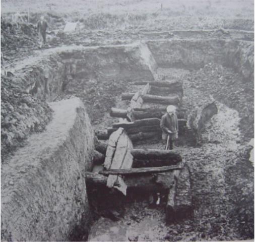 Areal: A = π (pi) • a • b (hvor a = halve storakse og b = halve lilleakse) (Kilde: B. Østergaard Pedersen ”Matematisk Leksikon”). π (pi) er kendt i Romerriget via Arkimedes (287-212 f.Kr.) og forståelsen af denne enhed kan derfor ikke benyttes som bevisbyrde da vor forståelse kan være kommet hertil fra Romerriget. Dette er dog ikke ensbetydende med at forståelsen er kommet til Norden via Romerriget da enheden ligeledes er kendt af Arybhata I (år 476-550 e.Kr.) i Nordindien. Jeg vurderer at vi har medbragt forståelsen af π (pi) under folkevandringen. Hvert hus lå 12 fod fra brændpunkterne, huslængden var 100 fod, største bredde 28 fod og gavlbredden 16 fod. Volden og voldgraven er fastlagt med samme stramme og helt utrolige forståelse for geometri. Voldens inderside har en radius på 234 fod. Voldbredden er 60 fod, bermen (et vandret stykke) er 20 fod bred. Voldgravens bredde er 60 fod, det samme som selve volden. I forborgen ligger ialt 15 huse, hver 90 fod lange. 13 af de sydligste (vist på billedet ovenfor) har en vest- og nordvest gavl der ligger på en cirkel med centrum i borgmidten og med en radius, der er det dobbelte af borgens indre diameter, dvs. 2 x 234 fod = 468 fod. Hus nr. 7 af de 13 huse, dvs. det huset i midten, ligger på diagonalen for den syd østlige kvadrant. Der er mange, mange videre geometriske sammenhæng der alle er ens, planlagt og derfor fuldt forstået. Trelleborg (og de andre 4 borganlæg Fyrkat, Nonnebakken, Aggersborg og Trelleborg, Skåne) er nok den mest geometriske fuldkomne konstruktion vi kender til i dag fra denne periode. Opmålingen i marken har kunnet gøres ved ganske simple redskaber af snor og pæle, men forudsætter en fuldstændig forståelse for geometri på højde med den vi kender til i dag. Kun en afgangseksamen fra ingeniørstudiet eller et matematisk studie vil give den viden der skulle til for at kunne planlægge Trelleborg. Det interessante ved denne fuldkomne geometriske forståelse er at det ikke kræver forståelse for tallet nul, hverken som en værdi i sin egen ret eller som en markering af plads med værdien ”ingenting,” for at kunne beregne sig frem til Trelleborgs udseende. Troldborg Ring, Vejle Ådal – Vermundr ’s ringborg ? Det er i denne forbindelse værd at bemærke at hverken borgen’s udseende (arkitekturen) eller virke (ingeniørarbejdet) er nyudviklet i år 980 e.Kr. Spredt over hele det nuværende Danmark findes flere ring- og halvkreds-borge fra jernalderen, alle med en markant beliggenhed i forbindelse med åer. Fra samme tidsrum kendes flere, indtil 12 km lange voldanlæg med tilhørende voldgrav, afskærende større landområder, omkring Vejle Ådal f.eks. Margrethediget og Trældiget. I nogle østjyske fjorde er der også fundet samtidige sejlafspærringer, hvor man med pæle har afspærret en hel fjord. (gengivet fra mærke opsat ved Ravning-broen’s lille museumshus).  |