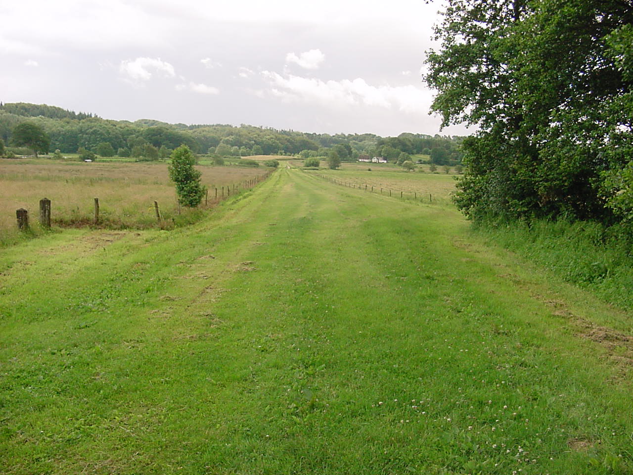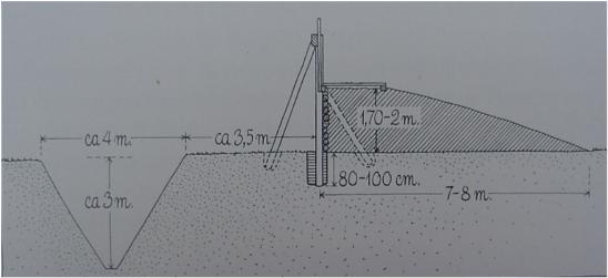 Søren Knudsen's forslag til Syd-virkets udforming; samlet bredde 10 m med voldgraven 2.5 m dyb. Den udgravede jord har skabt en jordvold på ca. 2 m. Sagnet forklarer os at voldgraven var så bred ”at der sagtens kunne sejle et skib med 48 tønder korn i den”. Rummålet 1 Tønde Korn = 139,20 liter, hvorfor 48 Tønder Korn = 6.682 liter eller ca. 6.240 kg. Da vi har et særskilt ord for vendernes snekke, "Vindasnekkjur", antyder det at vendernes snekke var lidt anderledes end vor egen. Fra de to skibe fra 800 tallet e.Kr. fundet ved Ralswich, Rygen ser det ud til at vendernes skibe er gjort efter vor bådbyggerskik. Vi ved at der i Vendersnekken 11. august 1135 e.Kr. under anfaldet på stapelstaden Konungahella var 44 mand og 2 heste (Heimskringla: Magnus Den Blinde og Harald Gille’s Saga, kap. 10). 44 mand x 80 kg (3.500 kg) + 2 heste (1.000 kg), i alt 4.500 kg. Det antyder at folkesagnet henviser til Knarr-skibet eller Busse-skibet, der var store og mere sødygtige fragt- og transportskibe, der i hvert fald i 1200 tallet har flere master og sejl. Selv så store skibe har, fladbundende som de var, ikke stukket mere end 1 m i dybde, og har derfor kunne sejle på voldgraven med mindre der blev spærret af med plove og harver (træstang med pigge) ved indsejlingen til voldgraven. Tegnet 17. januar 2008 til dette afsnit og benyttet med forlov. ”Denne Lod” er på marken lige syd for Højagergaard, vest for Gedser Landevej, lige over for afkørslen til Marielyst Strandvej (punktet betegnes på kort ”SB11”). Hr. S. Müller står derfor med ryggen til Væggerløse og kigger mod syd. På sin venstre hånd, mod øst, indtil Noret (”nord” må være fejl for ”nor”) lå i gamle dage fra 1880 en jordvold i mandshøjde, foran hvilken der mod syd løb en voldgrav (vist ovenfor). Uddrag fra kort udgivet af Videnskabernes Selskab (1776). Nærbilledet viser Væggerløse (Veigerlöse), Radbjerg (Raabierre) og Højet (Höyget). Den røde trekant er punktet ”Denne Lod”. Bemærk at der er rester af tydeligvis et stort skovområde, ligesom vi ser en langbro fra fastlandet til Bøtø. Bemærk også at der med stiplede linier er vist en ældre vej i landskabet, der allerede i 1776 er erstattet af den nuværende vejføring med Gedser Landevej. Da ingen af vore store virke er begået uden brug af sund fornuft må vi efterse hvorfor der bygges en jordvold lige syd for Væggerløse på tværs, og en voldgrav tværs over det sydlige Falster lige nord for ”Fugletungerne”. Vi finder voldgraven i en nordvestlig-sydøstlig retning 400 m syd for Marielyst Strandvej, overfor Skovby Tværvej, på marken nord for Brænderisvej 16 og syd for Brænderisvej 22, begge Højet, 4873 Væggerløse. For at kunne tilnærme os samtiden visuelt, gør jeg brug af et kort fra 1863, der er så fint optegnet at vi kan se samtidens vådområder, hvorledes markerne er pløjet, samt hvor Bøtø Nor gik til netop her. Vi er hjulpet på vej af stednavnet ”Spang” (ser ud til at være lige bag ved gartneriet på Marielyst Strandvej), fra ”spong” (oldnordisk), der betegner ”smal, let bro, bestaaende af enkelt bræt ell. planke, over et smalt vandløb (en bæk), en smal grøft olgn.; gangbræt;”. Ligeledes må ”tungerne” i ”Fugletungerne” være fra det oldnordiske ”túngeiri” (tun + gjærde), der betegner ”yderkanten af en Hjemmemark”, hvor ”Hjemmemarken” oprindeligt blev kaldt et ”tún”. Vi er derfor ved vandkanten, og vi har her tydeligvis det oprindelige fuglereservat i landskabet.  |
