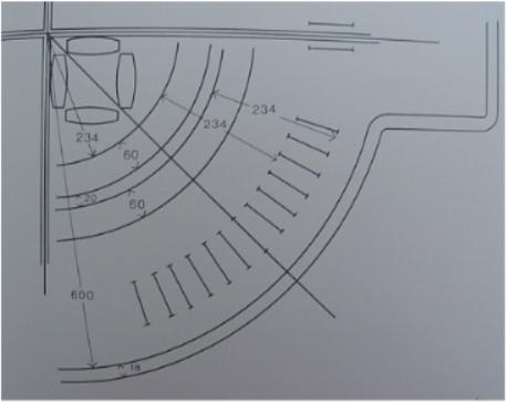 Den græsbelagte eng viser Ravning-broen i hele sin længde. Broen er bygget på befaling af Harald Blåtand omkring Ådalen ved Ravning Enge på det bredeste sted. Denne bro afløste tidligere broer over Ådalen, der har været til mindst siden vor ankomst til landet. Billedet taget juli 2004. Broen var 800 m lang, bygget på et i samtiden blødt, sumpet tærræn. Alle 330 brofag er ens, med fire 3½-4½ m lange bærende stolper i hvert brofag, flankeret af to mindre skråtstillede stolper. De skrå og lodrette stolper mødte hinanden 1,25 m over den daværende moseflade. Der blev brugt ialt 1350 bærende stolper/egetræer og 660 skråstolper. Egetræerne benyttet til broen blev fældet år 979 e.Kr. Måleenheden var 1 fod (30 cm). Afstandene mellem de bærende stolper er konstant (5 fod), stolpernes tværmål er konstant og det samme gælder afstanden mellem de enkelte brofag (8 fod). De enkelte brofags bredde er 15 fod. Broens bæreevne var mindst 5 tons. Der er fundet landmålerstokke efterladt op til de bærende stolper gjort af hasselgren. De bærende stolper er ”adhæsionspæle” dvs. de blev anbragt lodret hvorefter de ved deres egen vægt sank ned indtil moseunderlagets modpres stoppede dem. Samme teknik anvendes stadig i dag ved brokonstruktion over ”bundløse” strækninger. Trelleborg, Slagelse Borgen er bygget ca. år 980 e.Kr. efter en nøje fastlagt plan med 4 porte, et i hvert verdenshjørne, forbundet med to gader inde i borgen, der krydser hinanden i centrum af den cirkel der udgør den omliggende vold. Det menes at nord blev fastlagt ved at plante en kæp i jorden i borgens centrum. Herefter målte man kæppens skygge, og hvor den var kortest havde man nord. I Trelleborg har den nordlige port en afvigelse på 4º hvilket kan tyde på at borgen er anlagt enten tidligt forår eller sent efterår, hvor skyggerne er så lange at det er vanskeligt af afgøre hvor den korteste er (Fyrkat afviger kun 2º). Ved hjælp af plangeometri kunne herefter oprejses den vinkelrette linie/gade på den nord-sydgående gade/linie. De to gader skærer hinanden nøjagtigt i en vinkel på 90º. Måleenheden var 1 fod (29,5 cm). Kilde: Thorkild Ramskou’s ”Vikingerne som ingeniører” (s. 59). Herefter skulle landmåleren fastlægge storakserne for de ovale/ellipse-formede huse inden i selve borgen. De er anlagt parallelt med ringborgens hovedakser i en afstand af henholdsvis 24 og 148 fod. Borgen har derfor 4 kvadranter med hver 4 ellipse-formede huse i den indre borg. Alle er gjort fuldstændigt ens. For at kunne bygge huset må landmåleren have haft kendskab til at ”en elipse er det geometriske sted for de punkter, hvis afstande fra 2 faste punkter (brændpunkterne) har en given sum 2a”. a = den halve storakse b = den halve lilleakse A: (-a , 0) og A1: (a , 0) kaldes ellipsens toppunkter. Ligninger for en ellipse: (x - x1)² | | (y - y1)² | | | ——— | + | ——— | = | 1 | a² | | b² | | |