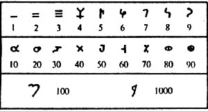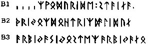 Vi kan fysisk bevise at tallene, som ovennævnte forklaring indikerer, virkelig er fra folkevandringstiden. TunesteinenRunestenen forefindes på Oldsaksamlingen, Historisk museum, Tulinløkka i Oslo og er ristet i 400 tallet e.Kr. Stenen har runeindskrifter på to sider, A- og B-sider, og B-sidens 3 linier lyder som følger: Omsat til vort nuværende alfabet: ????Rwoduride : staina : þrijoRdohtriRdalidun arbijasijosteRarbijano Dette kan muligvis oversættes til: ???? for WoduridaR : stenen : tre døtre delte/(behagelig)gjorde gravølet/arven de nærmeste/fornemste af arvingerne Kilde: www.arild-hauge.com Usikkerheden i oversættelsen omfatter heldigvis ikke ordet ”þrijoR” eller 3, og vi ser her formentligt den ældste kendte skrevne version af dette tal, der synes tættere på oldengelsk end oldnordisk. Vi har en række andre tidlige runeindskrifter, der endnu ikke er fortolket og som muligvis kan have forbindelse til tal, f.eks. Gadegård, Bornholm Brakteat/hængesmykke (DR AUD1994;268 Bornholms Museum) dateret til ca. år 500 e.Kr. med indskriften ”ota”. Dette kunne være tallet 8 da runegrammatik tilsiger at hvor der i ord er to på hinanden følgende ens runer, da udelades det ene. Illerup, Skanderborg, Århus Amt, Jylland (DR MS1995;337 Forhistorisk Museum Moesgård). Dupsko af bronze dateret til år 210/260 e.Kr. Indskriften lyder ”fir(h)a” eller ”fir(u)a”. Dette kunne være tallet 4 i en yderst tidlig version. Stentoften, Listers Herred, Blekinge. Ristning på sten af granit der står i Sølveborgs kirkes våbenhus og er dateret til kort tid efter år 0 (DR357). Indskriften lyder: niuhAborumR niuhagestumR hAþuwolAfR gAf j hAriwolAfR (m)A--u snuh-e hideR runono fe(l)(A)h ekA hed erA ginoronoR herAmAlAsAR ArAgeu we(l)Aduds| |sA þAt bAriutiþ Som jeg fortolker som: niuha borumR(,) niuha gestumR(,) HaþuwulfaR gaf jar(,) HariwulfaR makiu Snuhwe haidiR runono(,) felh eka hèdra ginnurunoR(.) hermalausaR argiu weladauþs(,) sá þat briutið og oversætter til: Niuha boer! Niuha gæster! HaþuwulfaR gav godt år(,) HariwulfaR(,) Snuhwe’s fælle skjulte runerne(.) faldt jeg her nærmere runer med forunderlige, skjulte kræfter(.) endeløs arg veldød(,) der dette bryder Mit gæt er at ”ni” i mandsnavnet ”Niuha” er tallet 9 (niu), og skal opfattes som at denne konge fra Uha-ætten, der er erilaR, har kendskab til alle 9 verdener, og hermed er ”Den Vidtseende” (tænk her på Widsið, Widsith-digtet). De fleste er også klar over at runerne, herunder Ældre Futhark , havde en talværdi, og at forståelsen af runer som tal blev brugt til at skrive ”hemmelige runer”, kaldet ”lønnruner” dvs. med en skjult mening. Man kender ikke den præcise årsag til at nogle runeindskrifter er hemmelige, udover det åbenlyse at kun de få der forstod talværdien og derfor kunne tyde runerne, skulle kunne læse dem. Ældre Futhark og talværdi: Mit forslag til hvorledes Ældre Futhark opstilles og rejses. Systemet var bygget op således at hvis man f.eks. vil henvise til f-runen så blev denne angivet som 1. rune i 3. ætt. Vi kender til ”hemmelige runer” fra første halvdel af 400 tallet e.Kr. med Ældre Futhark , f.eks. Tørvika A og B stenene fra gården Tørvika, Kvam, Hardanger, Hordaland. Vi ser at der i hver ætt er 8 runer. Vi har tidligere hørt at tallet 8 hed ”atta” på oldnordisk og “eahta, æhta” på oldengelsk. Der må være en god mulighed for at ordet “ætt” kan være en henvisning til tallet 8. Her følger et eksempel på ”hemmelige runer”: håndskrift i St. Gallen - Cod. 2704to) Kilde: www.arild-hauge.com/lonnr.htm For at fortolke ovennævnte ”hemmelige runer” skal man vide at de lange streger henviser til runens placering i ætten og de korte streger til hvilken ætt. Øverste linie bliver derfor i Ældre Futhark : 6. rune i 1. ætt = k 8. rune i 3. ætt = o 5. rune i 1. ætt = r 2. rune i 1. ætt = u 3. rune i 2. ætt = i Ifald man afprøver dette i det ovenfor viste skema bemærker man straks at dette ikke passer. Og det gør det ikke fordi runeristeren her har gjort det ekstra svært ved at ombytte 1. ætt og 3. ætt. Nedenfor vises endnu et eksempel fra Röksteinen dateret til år 810 e.Kr. Kilde: www.arild-hauge.com/lonnr.htm Lig her mærke til at kvistene på venstre side af hver rune angiver hvilken ætt der henvises til (1-3), og kvistene til højre angiver runens placering ætten (1-8). Vi er interesseret i ”hemmelige runer” fordi de blev tildelt en talværdi, og vi bemærker angivelsen af tallene 1-3 som vandrette eller lodrette streger: − = 1. = = 2. ≡ = 3. Alle de viste ”hemmelige runer” er fra langt før såvel indførelsen som indflydelsen af den katolske kristendom, og indiske tal er ukendt i det sydlige Europa indtil år 1202 e.Kr. Ældre Futhark blev ca. i 600 tallet afløst af Yngre Futhark der var under indflydelse af den katolske kristendom i et omfang, der stadig ikke er fuldt forstået. Nedenfor vises igen de indiske tal som de kendes i Indien i det 1. århundrede e.Kr.: Som man kan se er den visuelle beskrivelse af tallene 1-3 identiske i såvel Norden som i Indien i samme tidsrum. Dette er ingen tilfældighed. Der eksisterer et utal af alternative måder at angive tallene 1-3 på. At man begge steder valgte at benytte samme tegn kan kun skyldes at disse er udviklet af folkeslag med helt identiske skikke og tro, og som må have haft kontakt med hinanden før og op til disse tegn er udviklet. At vore tal har været et titalssystem, og at dette har indo-europæiske rødder, kan udledes ved at se på f.eks. tallet for 90. Dette tal hed på oldnordisk ”níutigir, níutíu” og på oldengelsk ”nigontig”. Begge ord er sammensat af tallet 9 + tigir/tig, der betyder ”gruppe af 10”. Mon ikke vi har et titalssystem fordi vi har ti fingre at tælle med. Men da vi tillige ved at 90 faktisk skal skrives halvfemsindstyve eller halvfem (5-½) + sinde + tyve kan vi tydeligt se at der på et tid