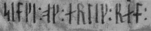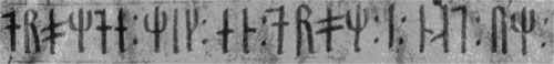 Stemplet er tæt på hvad vi ser på guldskilling "IK77" fra Jørlunde-skatten, Jørlunde Herred. Ravnen Hugin rådgiver rytten (Odin, Kongen)'s højre øre, der altid er det "rette" øre, jf. det oldengelske "riht" (nuengelsk "right"). Andre eksempler er ”ihhhu(d)uuRead(f)iiuhwsh-aiiuRm(l)hþila(l)(u)----R” (Sædding, Ribe Amt, Jylland, DR IK148EM85;520B, Mogens B. Mackeprang: De Nordiske Guldbrakteater, 1952, planche 5:21), og "sndi(l)iuuul(R)(l)(l)i(s)ius(a)hs(i)" (Kjøllergård, Vester Herred, Bornholm, DR BR78, Mogens B. Mackesprang: De Nordiske Guldbrakteater, 1952, planche 7:24). Herefter har vi rune-noderne til en meget benyttet trylleformel, hvis betydning vi i dag har glemt: : þmk : iii : sss : ttt : iii : lll : Þistil · Mistil · Kistil (Tidsel · Mistel[ten] · [liden] kiste) Runerne er ridset med Yngre Futhark og er de afslutttende runer i indskriften på Ledberg-stenen fra gravhøjen Ledbergskulle, Östergötland (Ög 181). Stenen er dateret til ca. år 1000 e.Kr. Som vi kan se skal trylleformlen afsiges således at det sidste ord ”Kistil” synges ”kiiissstttiiilll” dvs. ordet trækkes ud 1. 1 Trylleformlen kan også ses på Gørlev 1-stenen (Sjælland), indskriften ved ”Buslubæn” i ”Bósa saga ok Herrauðs”, og indskriften på runekisten i Lomen stavkirke, Vestre Slidre (Oppland). Med vor viden om hvorledes vi skal læse indskriften på Ledberg stenen kan vi nu skrue tiden tilbage til år 520-570 e.Kr. I en jydsk? kvindelig krigergrav på Isle of Wight finder vi en bronzespand, muligvis importeret fra det østlige Middelhavet. Ovenpå spandens udsmykning, og rejst uafhængigt af smeden der gjorde bronzespanden, har vi følgende runer ristet i Ældre Futhark (her omsat til latinske bogstaver): ”...bwseeekkkaaa”  |  |