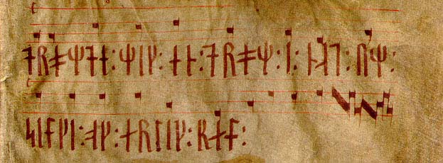 Min oversættelse til nudansk. Ordet ”langvini” mener jeg skal oversættes fra ”langvinnr” (langvarig) og ikke som værende sammensat af ”lang” + ”vinr”, dvs. ”langvarige/gamle venner”. Ordet ”lang” bruges ikke således på oldnordisk. Derfor har jeg ændret ”leiþa” fra ”lede” til ”leding”. En arabisk-muslimsk købmand Ibrahim ibn Ahmed al-Tartuschi besøgte Hedeby (Haitabu) år 950/973 e.Kr. fra Tortosa, Spanien der i samtiden var under muslimsk kontrol. Han beretter om indbyggerne i Hedeby at deres sang lød som hundegøen. Hans kommentar er uden tvivl en funktion af at han ikke kan sproget og at han, som muslim, ikke kan deltage i de ølforsamlinger, hvorunder sangene er blevet fremført. Det er formentlig ej heller et tilfælde at alle kilder synes at henvise til hundegøen. Dels havde vi vor Store Hund eller Grand Danoishunden, om hvilken der var og er stor respekt, og dels var ulven, og derfor dens tuden, et symbol på styrke. Unge kvinder, der har prøvet at gå forbi en byggeplads med mange unge mænd, fra Danmark til Amerika, vil vide at netop det at tude som ulven ligger utroligt dybt i vore skikke til trods for at stort set ingen byboere har set en ulv i mange generationer. At vi muligvis har overlevende eksempler på vore ”berkja/beorcan” eller ”hundegøen” viser Frands Herschend (Institutionen för Arkeologi och antik historia, Uppsala universitet) genialt i artiklen ”Sånger från mossen” (InfoArtefact nr. 4, 2005). Han påpeger de runeindskrifter vi alle kender til fra Ældre Futhark, der indeholder runegentagelser, grammatisk forkert i runer, i en tilsyneladende uforståelig orden. Hvad vi ser ristet nedenfor er Ældre Futhark benyttet som noder. Jeg viser i afsnittet ”Den røde og vrede C-tone” at runer netop må have haft denne benyttelse til at optræne sang , og at denne forståelse er medbragt under folkevandringen. Det forekommer mig at den sennordiske verseform ”runhenda (runhent), runhendr (som tillægsord), runhending” kunne være den oprindelige forståelse af "runer som noder". I sennordisk forståelse betegner ”runhenda” den verseform vi benytter i dag, nemlig ”enderim, afslutningsrim” efter hver anden sætning. Einarr Skúlason (ca. år 1090- efter 1160), islandsk skjald og præst giver et sennordisk eksempel i hans digt ”Runhenda” (vers 1 af 10): ”Jöfurr fýstisk austr örlyndr ok hraustr”. Ordet ”runhenda” er sammensat af ”rune” + det oldnordiske ”hending”, der direkte betyder ”griben med hænderne”, men også har betydningen ”rim, rimstavelse”, hvor det modsatte ord ”hendigalauss” har betydningen ”uden rim”. Det forekommer mig derfor at der er en langt ældre forståelse af ”runhenda” end den rytmiske enderimsdigtning, og at det netop er det rytmiske i enderimsdigtning, der er udslagsgivende for at denne digteform får betegnelsen ”runhenda”. Ifald vi i filosofi kan opfatte ”runhenda” som ”runer grebet med hænderne”, hvor hænderne, med hjertet, er menneskets rytmeboks, da har vi et ord der viser runer forbundet med noder. I jødiske Torah fremførelser fra 6-700 tallet e.Kr., i Byzans (Miklagård, Byzantine chant) og hos de nu romersk-katolske Frankere, begge i 8-900 tallet e.Kr. (Gregoriansk sang, Gregorian chant), ser vi en tilsvarende før-node teknik kaldet “Melisma”. De kristne og jødiske kolonier i det nordlige Indien startes op år 52-69 e.Kr. efter Jerusalem blev brændt af år 69 e.Kr. Det må være endog meget sandsynligt at teknikken ”Melisma” er hentet herfra. Ideen er her at man lader en enkelt stavelse strække sig over flere toner, hvor der i samme stavelse foretages toneskift. Som er tilfældet i vort brug af runer som noder, har ”Melisma” teknikken sine rødder i shamanens brug af sang til at skabe en trancetilstand. Ordet ”Melisma” (melodi) er fra det græske ”melizein” (at synge), fra det græske ”melos” (sang). ”ek erilaR sa wilagaR hat ek a : aaaaaaaaRRRnnn-b- muttt : alu :” 1
