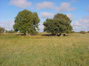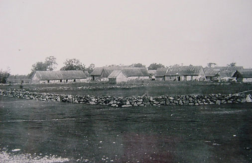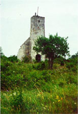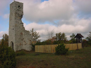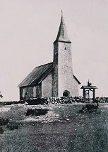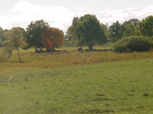 Billedet til venstre: Set fra Askom mod Bien (byen). Billedet til højre: Set fra Bien (byen) mod Askom. Billedet taget 28. september 2003. Her var en række store sten (flere hundrede kilo pr. stk) placeret i en cirkel, omkredset af store velvoksne træer, som der ikke er mange af på øen. Dette synes for mig som værende åbenlyst menneskeskabt og minder om enten en Hellig Lund eller et Tingsted. Alle stenene var overgroet med mos så det var ikke muligt for os at efterse om noget skulle være skrevet på stenene. Jeg tror næppe at de bosættere der ankom i 1400 tallet har haft deres tingsted her væk fra selve byen, hvor alle gårdene lå. Stedet er ikke afmærket på kortet, og det er muligt jeg tager fejl, men dette sted tror jeg er af meget gammel dato. Der foreligger også den mulighed at min placering af denne gruppe af sten på kortet ovenfor er forkert. Det er meget vanskeligt at orientere sig præcist på Odensholm da der ingen afmærkninger er og få naturlige ting i landskabet at afstikke en korrekt placering fra. Det er derfor muligt at dette sted kan være ”Galsve” i betydningen ”det hellige sted hvor der udøves trolddom”. Jeg kan nemt have begået en fejl på 300 meter. Jesu Kapell ”Jesu Kapell”, som kirken blev kaldt, blev opført i år 1765 og ødelagt efteråret 1941. Billedet til højre fra 1940 der viser kirken før ødelæggelsen. Kirken var omgivet af et stengærde og ligger på en lille bakke. Billedet til venstre overdriver dog bakkens højde. Der synes at have været en kirke fra år 1600 bekostet af den balttyske adelsfamilie på fastlandet under hvilken Odensholm hørte. Vi blev fortalt at russiske soldater efter 2. verdenskrig plyndrede stengærdet og alle kirkens murstene til at bygge deres barakker med på øen. Billedet i midten taget 28. september 2003. Noget af det første man bemærker sig ved synet af kirken på Odensholm er at den ligger helt forkert. Kirken ligger på den modsatte ene af øen i forhold til Bien (byen) og skolehuset. I estiske bygder lå kirken altid i centrum og bygden udgik herfra. Kirken er derfor placeret her af en anden årsag og denne årsag må være at en oprindelig helligdom har været ganske tæt på dette sted. Vender vi et øjeblik tilbage til legenden om Odin da får vi at vide at Odin er begravet på midten af øen i en gravhøj. Vi hører også at lidt syd fra gravhøjen på vejen var hvor indbyggerne forsøgte sig som gravrøvere. Jeg er ganske sikker på at kirken blev lagt oven på hvor sagnet fortalte at Odins grav var, og at det er på Kapplevägen (Kapelvejen), hvor den drejer mod syd, at man troede der var en gravskat. Jeg har markeret dette område på kortet ovenfor som en rød cirkel med et kryds. At man i dette område har fundet menneskeknogler burde ingenlunde overraske da kirkegården ligger ved Kapellet. Vi ved ikke hvornår man har fundet knoglerne eller forsøgt sig som gravrøvere. At legenden på dette punkt er så specifik tyder efter min mening på at denne hændelse, der uden tvivl har fundet sted, er af nyere dato, måske 16-1700 tallet. OdenstainDette stednavn, der naturligvis betyder ”Odin ’s sten”, ligger 3-400 meter fra Jesu Kapell.  |