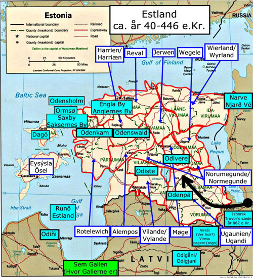 Kort over Estland. På fastlandet mod øst for øerne Odensholm og Ormsø i amtet Raplamaa (syd for Tallinn) har vi to stednavne: ”Othengat” som det fremgår af Valdemars Jordebog fra år 1231 e.Kr. og ”Ohekatku” på estisk. Den absolutte autoritet i estiske stednavne blev skrevet i 1933 af den dansk-estiske Paul Johansen, hovedarkivar i Tallinn i 1920-30erne. Hans værk ”Die Estlandliste des Liber Census Daniae” (værket begynder således: ”Til Minde om min Fader”) forbliver det værk hvorfra sandheden søges og blev skrevet som en gennemgang af de to Estlandlister i Kong Valdemars Jordebog. Netop dette stednavn er ekstremt interessant. Den oldnordiske version af ordet er klart sammensat af ”Othen” og ”gat” og må betyde ”Odins åbning” måske, lig Kattegat , en henvisning til noget tredje, f.eks. det foranliggende landområde på vejen til Odensholm /Odinsø. Det estiske ord for samme ”Ohekatku” oversættes dog til ”Bjørnens (våd)område” og Peeter Päll fra Eesti Keele Instituut er sikker på at dette er korrekt. Da jeg er sikker på at begge ord er en betegnelse for det samme og da begge oversættelser formentligt er korrekte har vi den situation at vi måske i den estiske version af ordet har navnet på en høvding af Danerne modsat den oldnordiske version af ordet, hvor hans tilnavn Odin bruges. Som forklaret tidligere har vi en sagnkonge fra før ankomsten til Fyn ved navn Bjaf/Béaw/Beowa. Beowulfkvadet omtaler denne høvding som Béowulf Scyldinga eller “Bjørnulv Skjoldunge”. Netop denne sammenhæng mellem Odin og Bjørn går igen i ordet Odenpä/Odenpäh/Otepää som bliver gennemgået om et øjeblik. Tæt på ovennævnte stednavn har vi stednavnet ”Odenswald” ("Ohukotsu" på estisk), der betyder ”Her er Odin herre”. Fortsætter vi folkevandringen tilbage mod Tanaisfloden , hvorfra jeg gætter på vi kom, så finder vi først mod øst stednavnet ”Odivere” i Jogevamaa amt. ”Ver” på oldnordisk kan betyde ”forsvar, omringe” og betydningen kan derfor være ”Odins værn” Længere mod syd i Viljandimaa amt finder vi stednavnet ”Odiste” som jeg ikke kan fortolke udover at det klart er en hentydning til Odin . I det sydligste amt Valgamaa mod grænsen til Letland finder vi stednavnet Odenpä/Odenpäh/Otepää. ”Pää” på oldestisk betyder ”hoved” og betydningen er derfor ”Odins hoved”. På estisk er betydningen ”Bjørn’s hoved” og vi genfinder samspillet mellem Odin og Bjørn. Vandrer vi videre ind i Letland har vi to stednavne: ”Odiñi” ude ved Rigabugten og ”Odingjåni/Odingjani” i lige fugleflugtslinie mod sydøst fra de estiske stednavne. Ordet ”gjarni” kommer af det oldnordiske ”gjarn” der betyder ”villig til at følge” og stednavnet betyder derfor ”Villige følgere af Odin ”. I afsnittet ”Estland” har jeg vist at uden undtagelse ligger alle ”Odin” navne i de landskaber jeg mener tilhørte Ver Asir/Danir-folket under deres korte ophold i Estland på vej mod vore nuværende landområder. |