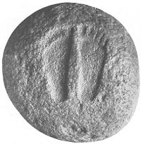 Som jeg oversætter til: Ene sad hun ude da du kom ind terror af Aserne og i (mine) øjne så. Hvad spørges mig? Hvorfor friste mig? Alt ved jeg Odin hvor dit øje faldt gemt væk i Mimirs brønd. Hver morgen Mimir drikker sin mjød af Valfaders ed Ved du end (mere) – eller hvad? Dette gentager Snorre Sturluson i Snorre Edda (år 1220-30 e.Kr.) med en henvisning til ovennævnte vers fra Völuspá og forklarer at Mimir er klog fordi han drikker mjød med sin hellige kop Gjallerhorn fra brønden med visdom. Alfader, dvs. Odin , gik til brønden og spurgte efter en enkelt kop, men fik det ikke før han gav sit øje. Ordet ”Mimir” menes at betyde ”mindet/erindringen”. At Odin ofrer sit ene øje for at få fyldt sin hellige kop med mjød og modtage visdom fra brønden under Verdenstræet skyldes at kun med visdom (fra fortiden) kunne han spå eller forudsige fremtiden. Dette har ikke ændret sig i dag og vil ej heller gøre det i morgen. En lille figur af kobber fundet i Lindby, Skåne. Forefindes nu på Statens Historiska Museet i Navavagen. Fordi figuren kun synes at have eet godt øje mener man dette forestiller Odin. Vi bemærker naturligvis også at Odin ikke opfattes som Gud i legenden hvilket er yderst usædvanligt da dette er tilfældet i alle vore nedskrevne sagaer. Odin var oprindeligt et tilnavn givet til eller en betegnelse for alle høvdinger af Ver Asir/Danir -folket. Disse havde alle status af Gud. Det lille samfund af katolsk-svenske bosættere der ankommer til Odensholm i 1400 tallet fra Finland (iflg. Piret Õunapuu) har uden tvivl været yderst gudfrygtige og kan have omfortalt legenden således at Odin ikke er Gud . Vi ser næsten Saxo gøre lignende i Gesta Danorum i år 1201 e.Kr. Men kombineret med resten af legenden, der tydeligt viser, at Odin opfattedes som en levende person, mener jeg vi med nogen rimelighed kan fortolke adskillelsen af Odin og Gud som et tegn på at Odin her skal forståes i den oprindelige betydning af et tilnavn givet til en høvding af Ver Asir/Danir -folket. Legenden omtaler at Odin blev gravlagt i en høj, og det er helt tydeligt at man har været overbevist om dette blandt indbyggerne på Odensholm, hvilket formentligt ikke er blevet formindsket ifald man, som legenden siger, har fundet menneskeknogler i gravstedet. Vi kan også se at indbyggerne på Odensholm har forsøgt sig som gravrøvere ved at lede efter den gravskat man har været overbevist om måtte forefindes i Odins gravhøj. Kaptajnen på vor båd fra Dirham til Odensholm forklarede også at de lokale på Odensholm i gamle dage havde forsøgt at finde en gravskat påøen, men at de ingen havde fundet. At menneskeknoglerne er beskrevet fundet på 1½ fods dybde gør at vi må sætte spørgsmålstegn omkring rigtigheden af dette. Menneskegrave er langt dybere (6 fod) og var stedet ikke omkring kirkegården, og langt fra byen, kunne dette lig vel være nedgravede ben fra får og grise. Hvad ovennævnte legende ikke omtaler, men som vi fik fortalt under vort besøg på Odensholm , er at det siges at Odin ”kom fra stedet med Odins fodspor til Askom”. Fodspor i arkæologi og legende Helleristning fra Tegneby, Tanum Socken, Bohuslen dateret til ca. år 1000 f.Kr. (bildnr. 31223121057, Raä nr. 33). Vi ser her en afbildning af to sæt fodspor. Billedkilde: Vitlycke museum, Tanumshede, Bohuslen Under Godensgård ved Limfjordens strand i det nordlige Himmerland er der fundet to indhuggede fodsåler svarende til sko-nr. 42. Tilsvarende fodspor i form af ca. 75 fodsåler findes på en helle ved ”Godegård” ved Fåglum i Västergötland. Fotografi af ovennævnte fodsåler fra Godens gård i Nordjylland. Fra www.arild-hauge.com/helleristngbild.htm Vi kender til brugen af ”goden” i runeskrift ved Nordhuglo runestenen, der oprindeligt stod på en gravhøj ved gården Nordhuglo påøen Huglo i Stord, Hordaland. Kilde: www.arild-hauge.com Indskriften lyder på vort alfabet: ek gudija ungandiR + ih eller im Og er oversat til: Jeg (er) goden, (jeg er) usårbar for gand, på Huglo. En Gode eller en Gydje var en tempelpræst(inde), hvis opgave synes at have været at foretage ofringer for bestemte guder, det være sig Freyr eller Thor . Adam af Bremen beskriver en sådan ofring i sin krønike år 1070-2 e.Kr. i Bog 4:XXVII der omhandler den berømte helligdomslund i Gamle Upsala 5 km nord for den nuværende by af samme navn. Odin har ikke en rolle i vor mytologi der gør ham til Gode. Han har en yderst vigtig funktion som Shaman, men dette er en helt anden arbejdsopgave i stammen end den rolle udspillet af en Gode og en Gydje. Derfor er det ikke sikkert vi kan sammenføre beretninger og fund fra Goder til legenden om Odin’s fodspor. Legenden om Den Levende BuddhaI afsnittene ”Odin og Den Levende Buddha” og ”Kushan Riget og Buddha” viser jeg at Buddha var en gotisk tronarving. Ved kort at gentage Fa-Hiens rejsebeskrivelser fra ca. år 402 e.Kr. kan vi se at Legenderne omkring Den Levende Buddha og Odin på Odensholm er identiske: ”Der er en tradition om at da Buddha kom til det nordlige Indien, da kom han til dette land, og at han her efterlod et aftryk af sin fod, som er kort eller lang afhængig af hvem der beretter. Det eksisterer, og det samme er sandt i dag. Her kan også ses klippen hvorpå han tørrede sine klæder, og stedet hvor han konverterede den onde drage.” At legenden om Odin på Odensholm er identisk med legenden om Den Levende Buddha i Nordindien er ingenlunde et tilfælde, og folkevandringerne har vist hvorfor vi bør finde begge legender hvor vi finder dem. Fodsporet fra SkythienHerodot (år 484-425 f.Kr) har ligeledes en beretning om fodspor (Histories, bog 4:82): ”Skythien har få bemærkelsesværdige ting.....Der er dog en anden spændende ting udover floderne og sletternes enorme størrelse – et fodspor efterladt af Heracles. De indfødte viser dette til besøgende på en klippe ved floden Tyras. Det er som en mands fodspor, men er 3 fod la