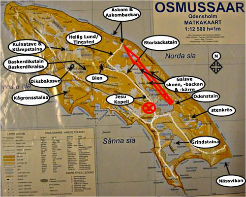 Min oversættelse til nudansk. Ordet "onféng" (undfang) skal opfattes som "modtog". Ordvalget skyldes at begravelsen er en tilbagevenden til søen, hvorfra samme person i fostervandssøen selv blev "undfanget". Jeg mener at ”leton holm beran” skal oversættes til ”lod ham fra holm rende” i det brændende langskib. Det er mit gæt at den i Beowulfkvadet omtalte gravsætning af Høvding Skjold Sheafsøn sker fra Odensholm , Estland . Henvisningen til ”segen geldenne” eller ”segl gyldent” er Skjoldungernes gyldne skjold, der sad i mastetoppen. Snorre Edda – Balders dødVi har en lignende beskrivelse af en begravelesceremoni i Snorre ’s beskrivelse af Balders død i Snorre Edda. Aserne tager Balders krop og bærer det til søens bred. Balders begravelsesskib hedder Hringhorn (Beowulfkvadet nævner også at Høvding Skjold Sheafsøn’s begravelsesskib har en ringformet stavn). Nanna Nepsdatter, Balder ’s kone, dør af sorg og bliver lagt i skibet sammen med Balder. Også Balder’s hest kommer med, hvorefter der bliver sat ild til skibet og det begiver sig afsted på rejsen til den næste verden. Stort set alle de vigtigste guder er tilstede ved denne ceremoni. Der er naturligvis mange forskere der har forstået lighederne mellem Beowulfkvadet og Snorre Edda. Jeg føler mig dog ingenlunde overbevist om at man bør overfortolke dette. Snorre Edda er en kompliceret opremsning af skikke, tro samt en begravelsesceremoni, der giver en glimrende forståelse af hvorledes man forstod dette. Alle begravelsesceremonier af vore høvdinger hvori et søsat begravelsesskib indgik har taget sig ud på denne vis. Beowulfkvadet er efter min mening et specifikt eksempel på hvorledes en faktisk høvding blev begravet. Odensholm og stednavne Stednavnene er indført på ovennævnte kort på basis af hvorledes de er afmærket på samme kort i originalstørrelsen, der dog ikke lader sig læse i den her viste størrelse. Eneste undtagelse herfra er afmærkningen af ”Hellig Lund/Tingsted” som jeg har indført og forklarer nedenfor. De med hvidt fremhævede linier viser de gamle hjulspor og stier, som stadig kan enten fuldt ses eller skimtes. Den med rødt optrukne pil fremhæver den del af legenden der fortæller at Odin kom fra ”Odinstain” til ”Askom.” Jeg har af pladshensyn været nødt til at fravælge utallige stednavne, og der er derfor en risiko for at jeg har udeladt meget vigtige stednavne, der kunne bibringe til den fulde forståelse for hvad der har fundet sted på Odensholm. Følgende stednavne er på originalkortet fremhævet som værende tilknyttet til legenden om Odin på Odinsholm: Baskerdikstain, Baskerdikraisa, Klåmpstaina, Kågronsstaina, Stenkrös, Storbackstain, Odenstain og Grindstaina. Med hensyn til forståelsen af de nordiske stednavne på Odensholm findes der tre kilder: Gunilla Harling-Kranck: Namn på Åkrar, Ängar och Hagar (1990)