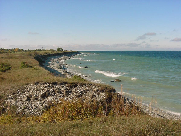 Billedet er taget 28. september 2003 med udsigt mod nordvest. 30 meter fremme hvor pilen med stednavnet ”Lihlhamne” (den lille havn) ender, begynder en ferskvandssø omgivet af et moselignende terræn. Odensholm består af småsten, ikke klipper, der gennem millioner af år har lagret sig. Ude ved kysterne har dette resulteret i kalkstensskær i form af flade og hårde plader, der ligger langs hele nordkysten. I ferskvandssøerne er dette materiale af småsten og kalk, mudderet, minder om ler, og man synker 5 cm ned. Dette er tilfældet i hele området omkring Jesu Kapell og området hvor Odinstain befinder sig. Her ligger oprindelsen til hvorfor legenden om Odin’s fodspor blev lagt netop på dette sted på Odensholm. Uden at jeg har prøvet det tør jeg dog godt tage et hvilket som helst væddemål på at hvis jeg havde skåret mine fodspor, aflagt i det hvide kalkmudder langs bredden af ferskvandssøen Lihlhamne, ud og lagt dem til tørre, så ville det hvide kalkmudder blive hårdt og en sten med mine fodspor ville stå frem for eftertidens mangfoldige overvejelser. Dette naturligt forekomne fænomen på Odensholm forklarer hvorfor beliggenheden af Odenstain ikke stemmer overens med legenderne. Der har uden tvivl eksisteret flere sådanne fodsporsplader på Odensholm. Fru Piret Õunapuu fra Eesti Rahva Muuseum har forklaret mig at man på museet i Tartu har et billede taget i 1940 af Odins fodspor. Pladen eller stenen med Odins fodspor skulle være blevet ødelagt af de russiske besættelsestropper efter 2. verdenskrig, idet Piret ikke mener at russerne muligvis har stjålet stenen som krigsbytte. Vi skal også være opmærksom på at fodspor i kalksten ikke kan være bevaret frem til i dag. Ligeledes at mange grupperinger, herunder specielt den katolske kristendom, har skabt røverhistorier omkring fodspor inklusive Fandens fodspor og Jesu fodspor i Quo Vadis-templet ved Via Appia i Rom. Legenden om fodsporerne kan derfor sagtens være en senere opdigtning af fri fantasi. Disse kvalifikationer i bedømmelsen forringer ikke værdien af legenden om Odin og hans fodspor på Odensholm. Tværtom forstærker det troen på at legenden kan have basis i virkelige begivenheder. Vore tidligste forfædre er, ligesom jeg, ankommet til øen for at undersøge den nærmere. De er, som jeg gjorde det, vadet ud på det hvide kalkmudder i troen på at det var fast underlag, og har så opdaget at det gav efter og frembragte fodspor. De har haft forståelsen for betydningen af fodspor i sten, specielt ifald det var høvdingen selv der gjorde dem, og dette har gjort Odensholm til et helligt sted fordi fænomenet har bekræftet en tro man allerede havde. På ferskvandsøen ses også mange par af knopssvaner, samtidens symbol på mindet om fortidens kvindelige krigere og heltinder, og dette har ligeledes forstærket Odensholm som et helligt sted. Andre Odin-navne i området