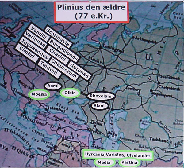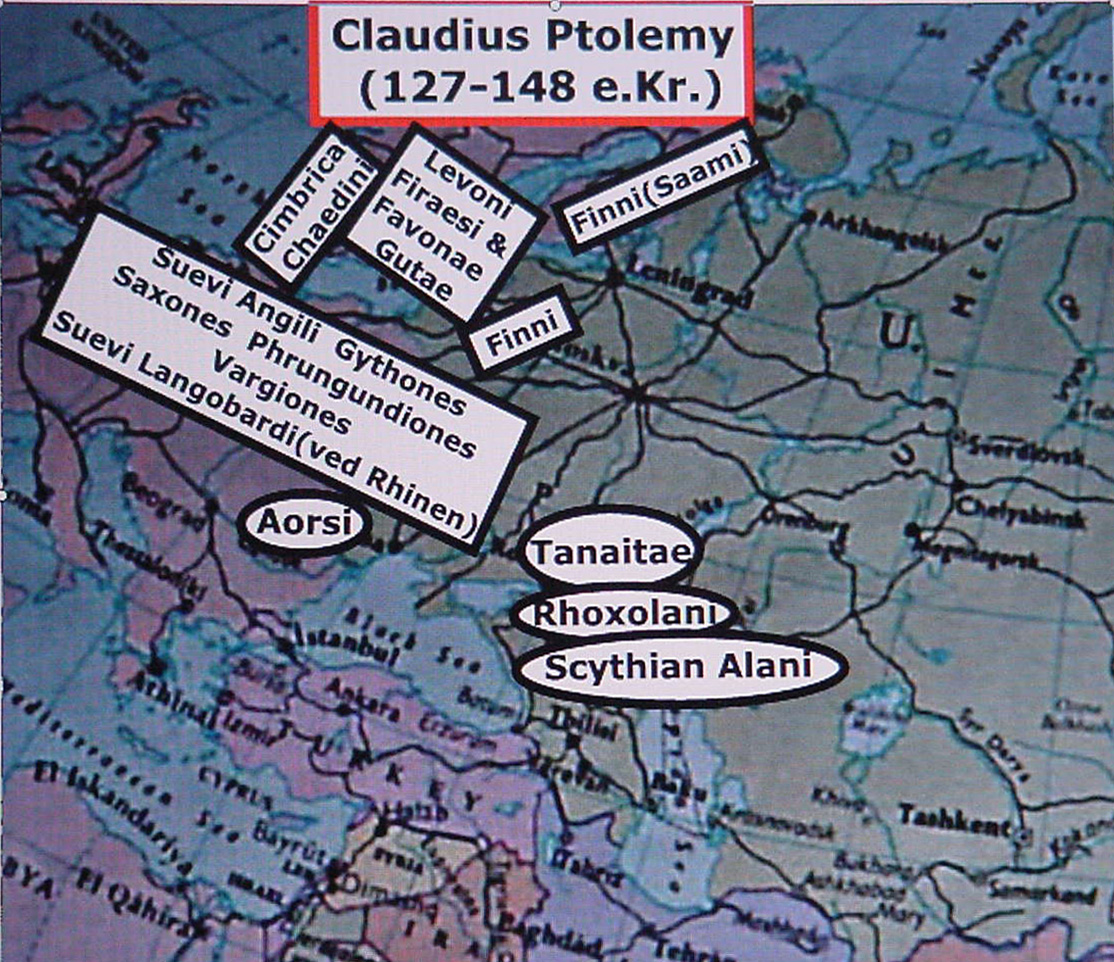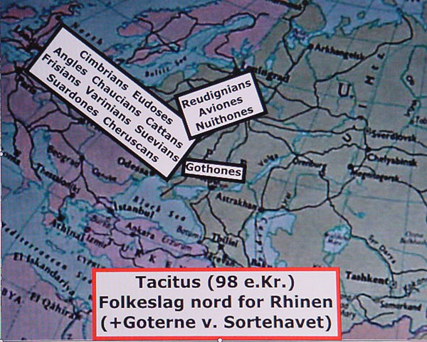 Kommentar: Inguacones folket = De der tilbeder Ing, dvs. Freyr , er ankommet. Ver Asir/Danir-folket ; Danerne, Anglerne, Sakserne og Friserne er derfor i området. Burgunderne har forladt Bornholm. Kimbrerne på vej tilbage til Himmerland. Plinius kender ikke til nord for Elben. Kommentar: Jyderne ”Eudoses” er nu kendt. Dele af Goterne ankommet til Sortehavet. Langobarderne, Burgunderne og Sakserne mangler. Tacitus kender os og vi samhandler med Romerriget. Kommentar: Her er forståelsen af Norden virkelig god, hvorfor samhandlen har været stor. Langobarderne på vej mod Lombardiet. |