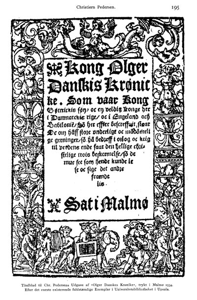 Titelbladet til Christierns Pedersens ”Kong Olger Danskis Krønicke” sat i Malmø 1534. Der findes to originaleksemplare: På Unversitetsbiblioteket i Upsala og i Svenska Akademiens Boksamling. Teksten siger (med mulige enkelte oversættelsesfejl): ”Kong Olger Danskis Krønicke. Som vaar Kong Gøtrickis søn, oc en veldig Konge her i Danmarckis rige/oc i Engeland och Babylonie so her effter bescreffuit, Steat De om haff store underlige oc madomelige gerninger/so ha Bedreff i orlog oc krig til verdens ende faat den hellige christielige trois Beskermelse/so de mue see som Bende kunde ie se oc sige det andre framde lis.” Denne krønike er fra udgivelsen en del af alle unges lærdom og genudgives mange gange, bl.a. af Nis Hanssen i ”Olger Danskes krønike” fra 1842 med fortale af ”justisraad, professor C. Molbech” hvilken udgave jeg har benyttet. Molbech skriver i fortalen (s. XXII) ”Endnu 1795 siger Nyerup om Holger Danske: ”at det er den almindeligste og meest undede af Almuens Morskabsbøger; den findes næsten i hver anden Bondehytte og forelæses hyppigen de hellige Aftener, eller ved kartegilder, humleplukken og slige Samquem”. Vi er så heldige at vi ved helt præcist hvordan Holger Danske blev opfattet visuelt af Christian II. og Christiern Pedersen. Skævinge Kirke, Sjælland. Holger Danske i senmiddelalderens ridderdragt. Dateret til år 1550 e.Kr. Ikke meget viking over denne forfinede og romantiske udgave af helten. Kilde: www.kalkmalerier.dk I værket ”København før og nu” (bind 5, s. 102) kan vi se at de to vandhuller i Fælledparken, overfor H.C. Ørstedinstituttet ved Nørre Allé i København, i slang kaldes ”Holger Danske’s briller”. Udtrykket opstod muligvis i år 1682 e.Kr. som en henvisning til Holger Dønnike, der boede i ejendommen Nørrebrogade 68. Såvel navngivningen af personen, som vandhullerne viser hvor levende Holger Danske var i befolkningens bevisthed i samtiden. Krøniken er naturligvis fuld af Middelalderens senere fiktive tilføjelser af hændelser der ikke kan være historisk korrekte i forbindelse med Holger Danske. Kort fortalt så nægter Kong Gøtrik/Godfred at hylde Karl den Store/Charlemagne. Olger/Holger bliver givet som gidsel til Karl den store indtil Kong Gøtrik/Godfred indfinder sig ved hans hof og accepterer frankernes overherredømme. Dette sker naturligvis ikke. Kong Gøtrik/Godfred dræbes af ”een af sine egne Tjenere i sin Seng om Natten” (s.64) og Olger/Holger bliver konge af Danmark. Her bliver han i 5 år (s.66) og drager herefter tilbage til Karl den Store/Charlemagne, hvorefter han klarer verdenssituationen. Kom ihu at den katolske kirke i Christiern Pedersens samtid er ved at blive smidt ud af Danmark (sker ved lov i 1536) og som vi har set er Christiern Pedersen dybt involveret i dette på alle måder. Hans Tausen er i fuld gang med at vinde lydhør for at Danmark skal bryde med Rom. Christiern Pedersen oversætter, iflg. Professor C. Molbech i fortalen, i fri stil fra originalen ”Ogier le Dannoys”, men kommenterer hvor hans oversættelse kommer i konflikt med hvad der var gængs tone i Danmark år 1534 e.Kr. F.eks. hvor Olger ”skal komme tilbage mod dommedag og stride mod antikristen med sværd og spyd” kommenterer Christiern Pedersen at der intet herom findes i den hellige skrift – den katolske kirke mod den protestantiske udgave. Ligeledes da der i krøniken nævnes ”de sex dejlige skinnende Jomfruer, som man kalder Vætter” som i krøniken kommer og give den nyfødte Olger hans Orlög, dvs. spår om hvad fremtiden vil bringe (se ”Enfances Ogier” i digtet). Om dette skriver Christiern Pedersen ”det er ikke troligt, at så skulde skeet, men det er Fabel og opdigtet Ting”. Alle med viden om den forne sæd vil vide at vætter er en dybt integreret del af vor oprindelige skikke og tro. Vætter er naturånder, der bor bl.a. i sten og jord. Gårdboen, den senere julenisse, på gårdene er en vætte. I 1900 tallet er vætter en betegnelse for personer der giver smør og kærnemælk til en bestemt sten, dvs. foretager en ofring til vætterne. Men det absolut vigtigste i krøniken er at Christiern Pedersen, lig i den frankiske ”Chevallerie Ogier” (Ogier’s Ridderfærd) fra slutningen af 1100 tallet, gør Olger til søn af Kong Gøtrik. Dette er en direkte videreførelse af beretningen i Karlamagnús saga ok kappa hans - Karl Magnus’ krønike. Vi har netop hørt at Christiern Pedersen, samtidigt med arbejdet på ”Kong Olger Danskis Krønicke” i Paris, udgiver ”Saxos Danmarkskrønike” i samme by år 1514 e.Kr. Han kan derfor Saxo i søvne og ved med det samme hvad Kong Godfred’s søn hedder. Saxo er den eneste historieskriver der omtaler Kong Godfred som Kong Gøtrik og i bog 9 forklarer Saxo os at sønnen hedder Olav/Oluf. Derfor skriver Christiern Pedersen ”Hvem Karls Hofsinder kaldte Olger paa deres Maal, som er Oluf paa Danske”. I 1842 udgaven henviser 1. kapitel direkte til Saxo. Det må i denne forbindelse være indlysende at Karlamagnús saga ok kappa hans og Saxo i Gesta Danorum har en identisk kilde eller mundtligt sagn som grundlag for beretningen om Kong Godfred eller Gøtrik/Gøttrik. Saxo (bog 7:75, 9. bog Fra Gøtriks Fald til Gorm den Gamles død) skriver: ”Ole (Olavus) var Gøtriks Søn (Gøtrici filius) og blev Konge efter sin Fader, men ved at ville hævne hans Død, kom han en Borgerkrig afsted, som kostede ham Livet og paadrog ham den Eftertale, at han elskede sin Fader højere end sit Fæderneland. Han ligger for Resten begravet tæt ved Lejre (Lethram), i en Høj som bærer hans Navn.” Saxo blev i samtiden anset som en fuldstændig pålidelig kilde og Christiern Pedersen’s konklusion er derfor i samtiden helt forsvarlig. I det 20. århundrede er Saxo i stigende grad blev afvist som en sandfærdig kilde fordi vi nu ved at han mange steder roder rundt i personer, tid og sted. Saxo er dog stadig en yderst vigtig kilde, men kræver stor