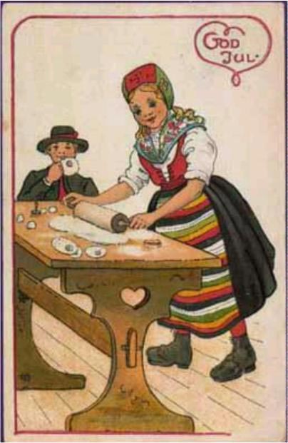 De bages øverst i ovnen ved 170 grader i ca. 5-6 minutter. Først når kagerne er helt kolde lægges de i dåse, der lukkes tæt - evt. med en serviet under låget. (Kilde: Vinder af dagbladet Politikens DM i småkager i 1998. Opskrift af Grete Verdich). Pebernødder Disse blev oprindeligt gjort af rugmel, honning, malurt og stærke krydderier. Fordi man ikke kendte til hjortetaksalt var de hårde som nødder, og det er naturligvis derfor de hedder ”krydrede nødder” eller ”pebernødder”. Fra Peters jul (år 1866) IX. Nytårsaften, vers 1: Jo, vi kan lugte, at Karen bager, mens vi spiller gnav om peberkager Opskrift – pebernødder1250 g mel 250 g farin 1½ kvt ingefær revet skal fra en citron 1 tsk potaske lidt peber 750 g sirup 375 g smør Fremgangsmåde: Alle ingredienser, på nær mel, blandes sammen og varmes op. Når det er godt varmt drysses melet i. Dejen sættes til hvile en dag. (Kilde: Olde Dorthea’s opskrifter. Indsamlet 1912-1958) En alternativ oprindelig fremgangsmåde synes at være at opvarme sirup (mørk) og margarine/smør til kogepunktet. Herefter nedkøles massen og de øvrige råvarer tilsættes. Den færdigblandede dej hensættes herefter i 3 døgn til ”modning” for at opnå den rette afrundede krydrede smag. (Kilde: Erik Østergård) Når dejen er klar rulles den ud i en fingertyk cylinderform. Herfra skæres i 1 cm stykker. Ved brug af håndfladerne rulles de afskårne stykker til kugler, trykkes lidt og lægges på en bageplads med bagepapir. Herefter bages ved 200º i 10-12 minutter. Bagværk ved juletid Gammelt norsk julekort HonningkagerHonningkager har en ekstrem stærk etymologisk forbindelse til vore urskikke, herunder Juletræet som Verdenstræet. Verdenstræet Yggdrasill, asketræet, er Verdenstræet som følge af dette træs forbindelse til honning, der via mjød, gav mennesket muligheden for at kommunikere med guderne/forfædrene. Grækerne, inderne og vi (helt op til og med Peder Laales Danske Ordsprog ) var overbevist om at det var bier der spiste honning og herefter bragte den ned til Jorden. Derfor er de symbolske honningkager på Juletræet og i juletiden ufravigelig. Fra Peters jul (år 1866) IV. Ved juletræet, vers 2: (om hvad der hænger på juletræet) Og kagedukker, som hænderne ned i bukselommerne proppe! ...... og et par strømper af kage og kræmmerhuse, som helt er fyldt med ting, som jeg nok gad smage! Som vi vil se var klejner og fladkager også honningkager. ”Peder Syvs kjernefulde Ordsprog” (1807, s. 66 & 200): "Man kan og fedes ved honnngkage" "Honningkage bliver man ogsaa kjed af" Opskrift – honningkagefigurerDenne opskrift er god til at lave honningkage-figurer til juletræet. Man kan enten købe formerne og stikke figurerne ud eller skære dem ud efter egen fantasi. Som former foreslås Juletræet (Verdenstræet), Svanen (symbolet på vore kvindelige krigere), Julemanden (Odin ), en kvinde (symbolet påHúsfreyja, det oprindelige udtryk for husmoder) og Grisen (ofring til Freyr og Moder Jord på Moders Nat, uden hvilken Balder ikke genfødes juledag). 250 g farin 450 g honning 110 g smør eller margarine 1 tsk. kanel 1 tsk. allehånde 1 tsk. ingefær 1 1/2 tsk. tvekulsurt natron ca. 700 g hvedemel Glasur: ca. 200 g flormelis 1 æggehvide frugtfarve Fremgangsmåde:
