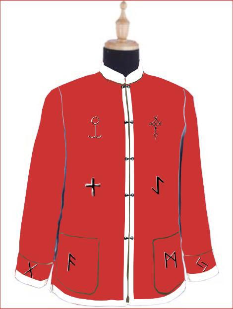 Symboler og forklaring:Selve jakken er baseret på den traditionelle kinesiske jakke og valget af dette design symboliserer alliancen mellem Asgård og Midgård , mellem Ver Asir/Danir -folket og det kinesiske folk. Alliancen blev indgået ca. år 115 f.Kr. Den røde farve var den obligatoriske farve for krigerrangen/Jarl æt under Jólahald – julehold, og blev ikke kun benyttet til ceremonier. De røde klæder var derfor foret og den hvide kant i kraven og langs jakkens kanter symboliserer jakkens foring. (Fundet ved landsbyen Porogi, Kiev, Ukraine. I graven, dateret til 1.århundrede e.Kr., var resterne af en rød læderjakke, røde bukser fastgjort med en rød læderrem med et bæltespænde af bladguld over jern. Jakken havde fåreskinds foring og var fastgjort med to fibulae. Håndgrebet på sværdet var rødt læder.) På højre ærme er følgende symbol: Runen Gebo fra ældre Futhark der betyder gave. Lyd: G Anglo-saksisk navn: Geofu (Gyfu) Oldnordisk: Gipt, Giöf, Gjöf