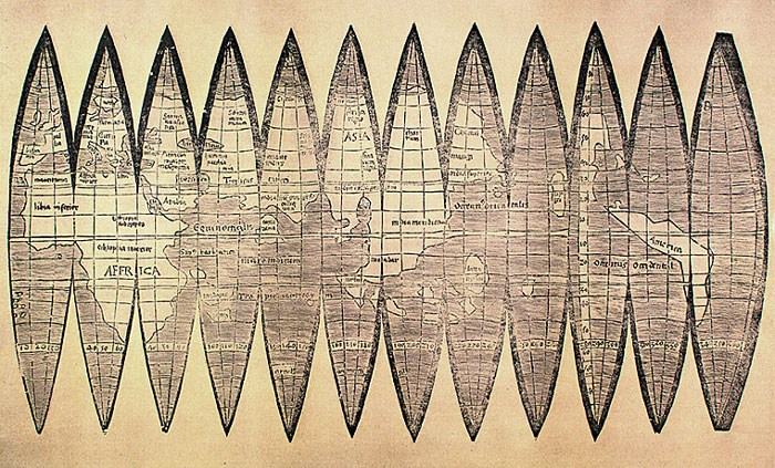 Min oversættelse til nudansk. Nýaland (Terra Nova, New(found)land)'s østkyst, syd for breddegradskursen, er også afgrænset af to portugiske kongeflag. Landskabet er påført mangfoldige ekstremt høje træer (= "mastos" i indskriften), der skal symbolisere grantræer (Eastern White Pine, Balsam Fir), fra hvilken skibsmasten blev lavet. Der er tænkeligt at der her henvises til den lille fjordby Milltown-Head Bay d’Espoir, dybt inde i en fjord på sydkysten af Newfoundland. I hvert fald fra 1789 fremefter er netop dette sted kendt for sit bådværft og skovning af 30-50 fod høje træer til brug for sejlmaster. Dette kan vel være et langt ældre hovedvirke for denne landsby. I kortets venstre side ses det sydlige Amerika som fysisk adskilt fra det nordlige Amerika, dvs. det ikke-indtegnede er ukendt land,. Vi ser Florida gengivet og Cuba (Ilha d Isabella = Fru Isabella's Ø = den spanske Dronning Isabella I. til Castile). Billedkilde: la Biblioteca estense universitaria di Modena, Modena, Italien. Tak til Fernando Kvistgaard for henvisning til kortet 19. maj 2011.