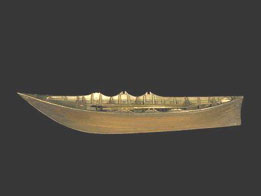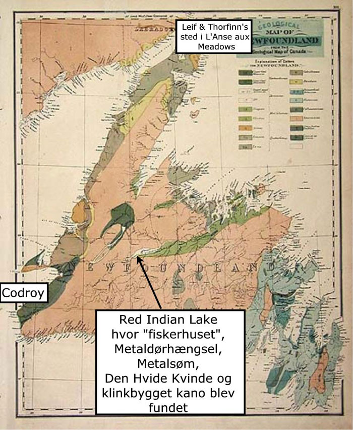 Richard Whitbourne udgav år 1622 e.Kr. ” A Discourse and Discovery of the Newe-founde-lannde”. Han skriver: ”...for det er velkendt at de indfødte disse steder har et stort lager af rød okker, som de bruger til at bedække deres kroppe, buer, pile og kanoer på malende vis; hvilke kanoer er deres både som de bruger på søen, der er bygget som ”wherries” på Themsen floden, med småt træ, ikke tykkere eller bredere end tøndebånd (hoops); og i stedet for borde bruger de barken fra birketræer, som de sammenføjer tæt sammen, og de overdækker sammenføjningen med harpiks, som beg/harpiks (pitch) bruges i sammenføjningen på skibe og både;....” En ”wherry”1 er en klinkbygget robåd der blev brugt til transport på Themsen og i Norfolk, Øst-Anglen og hvis oprindelsen er fra før 700 tallet e.Kr. hvorfor dens oprindelse er identisk til Færøbåden. 1 Mit gæt er at ordet er forbundet med det oldnordiske ”Hvargi, Hvergi” i betydningen ”hvorsomhelst”. I en Beothukgrav fundet i september 1886 lå en 10-12 årig dreng begravet. Han var bl.a. begravet sammen med en træfigur af en dreng og 2 små barkkanoer (rejsen med båd i begravelsesskikken fra den forne sæd). James P. Howley skriver i ”The Beothucks or Red Indians: The Aboriginal Inhabitants of Newfoundland” (1914): ”Disse efterladenskaber blev fjernet fra deres hvilested af mig selv i september 1886..... jeg har en ide om at den skarpe V-form af bunden af kanoen var for bedre at kunne besejle vor hårde klippefyldte floder...” Til venstre: Model 1:32 af en wherry der sejlede mellem Kew Gardens og Brentford ca 1890. Denne viste udgave blev benyttet som vandtaxi og stavnen er specielt tilpasset til at undgå skumsprøjt. Modellen gjort af T Ward & Sons, Rotherhithe. Til højre: Model af hvorledes man mener en Beothuk kano tog sig ud. Kilde: National Maritime Museum, London og Newfoundland Museum, St. John’s, Newfoundland. Der fandtes utallige variationer af wherry-båden afhængigt hvor den skulle bruges og til hvad formål. Derfor skal vi ikke tage ovennævnte billede og forestille os at den beskrevne båd i Newfoundland i år 1622 e.Kr. har set netop ud som den viste model. Hvad er vigtigt her er at forstå at der i Newfoundland i år 1622 e.Kr. findes en bådtype identisk til den der kendes i samtidens London, og sidstnævnte båd har samme oprindelse til Færøbåden, og derfor hvorledes byggeskikken på Grønland har taget sig ud. At træbordene er udskiftet med skind og bark kan oprindeligt skyldes manglen på træ, men måske senere at båden fik en dobbeltfunktion som hav- og flodbåd. Det synes endnu ikke at være undersøgt hvorledes grønlændernes klinkbyggede robåd tog sig ud i Eystribygð og Vestribygð. Andras Mortensen, Føroya Fornminnissavn, Tórshavn har forklaret mig at heller ikke på Færøerne og Island havde man træbevoksning - og dog byggede man klinkbyggede både via import af træ. Ligeledes ankommer inuiterne først til Grønland i 14-1500 tallet og derfor skulle man umiddelbart ikke tro at grønlænderne har eftergjort inuiternes kajak eller umiaq, begge bådtyper betrukket med sælskind. Det viser sig dog at være en forkert slutning, der underbygges af bemærkningen i værket ”konúngs skuggsjó” (”kongens skygge” eller ”kongespejlet”) nedskrevet samtidigt ca. år 1154-1200 e.Kr. (Grønlands Historiske Mindesmærker (1845, 3. bind, s. 317): ”En Þat hafa aller til ráðs tækit, Þæir sæm í Þæssa ísa voc hafa komit, at Þeir hafa tækit smábáta oc drægit á ísa upp mæðsèr, oc hafa leitað lannzens, en hafskip oc allr annarr fjárlutr Þa hæfir Þar æpter dvalz oc týnz, en sumir hafa oc úti búit síðan á ísum, áðr en Þeir hafi lannde náð fjóra daga eða fim oc sumir ænn lænngr”. Der oversættes til: ”Til dette Middel have alle de grebet, som ere komme i dette Iisdrev, at de have taget smaae Baade og trukket dem op med sig paa Isen, samt sögt saaledes Landet, med Havskibet og alt andet Gods er blevet der tilbage og forgaaet; nogle have endog, förend de naaede Land, maattet opholde sig 4 til 5 dage paa Isen, ja andre endnu længere”. Det lyder for mig ganske usandsynligt at grønlænderne har trukket deres redningsbåde eller ”smábáta” over isen i op til 5 dage ifald vi her taler om klinkbyggede både bygget udelukkende af træ. Sådanne både er for tunge selvom vi ved at vi i 1700 tallet brugte isbåde til transport over Storebælt i kolde vintre. I sidstnævnte tilfælde er der dog tale om en bevist og planlagt transport, ikke livstruende omstændigheder. Det må være en mulighed at vi her hører en specielt bygget redningsbåd omtalt, der måske kan være omtrukket med huder. Netop denne bådtype kan vi bevise fandtes på Grønland, og vi kender den i dag som en "konebåd" (umiaq). Vi kan ligeledes vise at grønlænderne kendte til båden allerede fra ca. år 1000 e.Kr., og måske nøjagtigt hvorledes de først får fat på 3 af slagsen. Uddrag af kort nr. 8 Peary Land (kort 8d) fra Geologisk kort over Grønland 1:500.000, Danmarks og Grønlands Geologiske Undersøgelse. Kilde: www.geus.dk Konebåd dateret til ca. år 1440 e.Kr. fundet af Eigil Knuth og Jens Geisler i 1949 på Herlufsholm Strand ved Kølnæs, Herluf Trolle Land, Det nordlige Grønland. Båden er over 11 meter lang, dvs. som en seksæringur til 12 mand, og er bygget op omkring et træskelet og overtrukket med skind. Fundet kan nu ses på Grønlands Nationalmuseum. Billedkilde: fra artikel skrevet af Hans Lange, museumsinspektør. Fundstedet "Kølnæs" er identisk til "Kjalarnes" hvor Erik Den Røde's søn Thorvald opstillede en lodret skibskøl på et næs. Vi lader Erik Den Rødes Saga berette: Thorvald er rejst til Vinland med 30 mand i et enkelt skib. De forbliver en hel vinter i Leifsboder (Leifsbúða 1, som man regner med er det opholdsssted broderen Leif Den Lykkelige grundlagde i Nýaland, i dag kendt som L'Anse aux Meadows, Newfoun