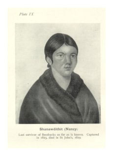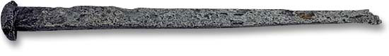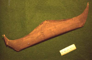 húðkeipr - sælhundeskind(sbåd) - konebåd - umiaq Nanortalik Museum. Billedkilde: John Rasmussen, Narsaq Foto Sir Joseph Banks var naturhistoriker og besøgte Newfoundland og Labrador sommeren år 1766 e.Kr. Han skriver i sine optegnelser fra år 1766 e.Kr., efter hans beskrivelse af wigwam (whigwham) beboelsen, følgende: ”Af de vinkelrette beboelser blev kun to set på hele rejsen; én ved Sabbath Point i Lieutenant’s Lake 1, og den anden en kort vej ovenfor Little Rattle. De var meget lig hinanden og ved undersøgelse af sidstnævnte fandt vi den rektangulær, udformet næsten som et engelsk fiskerhus, kun var bindingsværksstolperne (studs 2 ) lidt fra hinanden, fra hvilke det stod klart at de i denne tilstand ikke alene kunne forme underhuset (shell), som i engelske bygninger, hvor de er tæt sammenføjet. Men ca. 18 inches (46 cm) inden for og parallel til dette (bindingsværket) var der endnu en ramme af mindre håndværksmæssig kvalitet gående til loftet. Fra håret klinet til stolperne så det ud som om dette mellemrum havde været fyldt med dyreskind, der ikke kunne være bedre gennemtænkt for at holde kulden borte. Kun 3 sider var således bygget, den fjerde (side) bygget med tømmer gjort firkantet og placeret horisontalt ovenpå hinanden med mellemrummene tætnet med mos. Forskellen skyldes muligvis manglen på skind da denne ringere side af beboelsen lå mod sydøst, hvilket krævede mindre beskyttelse end de andre (sider). Anbringelsen af tagspærrerne på bjælkerne og de nødvendige samlinger var gjort så præcist som i husene beboet af vore fiskere. Taget var en lav pyramide, omgivet i en afstand af 3 fod (91 cm) fra dets toppunkt af et tøndebånd (hoop) sat fast på tagspærrerne med læderremme. Her stoppede tagdækningen og området ovenfor tøndebåndet var åbent, som i en wigwam, for at røgen kunne komme ud, ildstedet, jvf. skikken, værende i midten. 1 Menes at være Bloody Pt, Red Indian Lake i den vestlige del af det indre Newfoundland. Se det arkæologiske fund nedenfor. 2 Et lerklinet hus kaldes på engelsk ”stud and mud house”. Vi har tidligere vist at Beothuk stammen var et nomadefolk hvis huse alene var wigwam-teltet. Beskrivelsen af et hus med vægge og tag bygget identisk til et engelsk fiskerhus, der naturligvis er identisk til vor egne fiskerhuse og byggestil, kan kun skyldes at dette hus må være bygget af nordeuropæere, muligvis grønlænderne. Metaldørhængsel udgravet fra Indian Point, Red Indian Lake, Newfoundland. L: 6.25 inches (15.9 cm) (Dateret til sidst i 1700 tallet e.Kr. Er beskrevet som kommende fra et Beothuk hus, dvs. uden for de nye engelske bosætteres område ude ved kysten. Kilde: Canadian Museum of Civilization (DeBd-1:1832) Metalsøm udgravet fra Indian Point, Red Indian Lake, Newfoundland. L: 4.25 inches (11 cm) (Dateret til sidst i 1700 tallet e.Kr. Er beskrevet som kommende fra et Beothuk hus, dvs. uden for de nye engelske bosætteres område ude ved kysten. Kilde: Canadian Museum of Civilization (DeBd-1:1836) Brugen af dørhængsler og metalsøm og dermed behandling af jern er ikke et oprindeligt håndværk fra de oprindelige beboere på det nordamerikanske kontinent, men vor egen teknik videreført af grønlænderne, og sikkert medbragt til Newfoundland. Fra James P. Howley’s ”The Beothucks or Red Indians: The Aboriginal Inhabitants of Newfoundland” (1914): ”En gammel mand Georges Wells, fra Exploits Burnt Island, gav mig følgende oplysninger i 1886. Han var da en mand på 76 år......Wells er sikker på at de (Beothuk) forstod at varme og behandle jern, han siger de lod det (jernet) være i flere dage i ilden for at gøre det blødt. De brugte en gammel økse, satte den ind i en samling af træ, med den skarpe ende vendt op, hvorefter de bearbejdede jernet frem og tilbage indtil det fik den form de ønskede og herefter gjorde de den skarp på en sten.” T.G.Lloyd oplæste 1873-4 to foredrag om de røde indianere fra Newfoundland på The Antropological Institute of Great Britain 1. 1 T.G.B. Lloyd, C.E., F.G.S., M.A.I, ”The Red Indians of Newfoundland”. Fra James P. Howley’s ”The Beothucks or Red Indians: The Aboriginal Inhabitants of Newfoundland” (1914). Hans andet foredrag behandlede hovedsagligt sten, ben og andre redskaber han selv havde fundet under hans rejse på øen. Han begynder med at opremse de steder hvor han har fundet genstandene og nævner bl.a. Codroy River og ”i det indre ved Grand Lake, Sandy Lake, Red Indian Lake”. Han opdeler genstandene i 9 forskellige kategorier og kalder kategori 9 ”slibesten, skuresten og andre forskellige genstande”. Under kategori 9 skriver han: ”(9) forskellige genstande, en af hvilken, et tyndt stykke glimmeragtig sten ca. 10 cm lang og 1 cm bred omkring midten, spids i begge ender, derfor visende 4 grupper af småindskæringer på den ene side af stenen. Med næsten ens afstand mellem sig er indskæringerne samme længde. Udover dette, adskillige syle-formede redskaber af hornsten, en af dem visende mærker af slid på spidsen, en anden delvis takket på den ene side. Lignende boreredskaber af flint er blevet fundet i Danmark sammen med skrabere og andre redskaber, utallige skuresten og fladsten, åbenbart slibesten etc... ”. Jeg er naturligvis ikke den første der foreslår at Beothuk stammen på Newfoundland i virkeligheden er grønlænderne. Dette forslog William Epps Cormack (1796-1868) allerede i 1800 tallet efter at han selv havde berejst området fra 1822 og nedskrevet Beothukstammens sprog fra Shanawdithit’s forklaringer. James P. Howley forklarer i ”The Beothucks or Red Indians: The Aboriginal Inhabitants of Newfoundland” (1914): ”Hr. W.E. Cormack, denne dristige og foretagsomme herre, der hengav så megen tid og penge for at frembringe venskabelige forbindelser med de stakkels Røde mænd, og som også gennemførte en indgående undersøgelse af alt vedrørende deres væremåde, skikke, sprog etc., fremkom med i